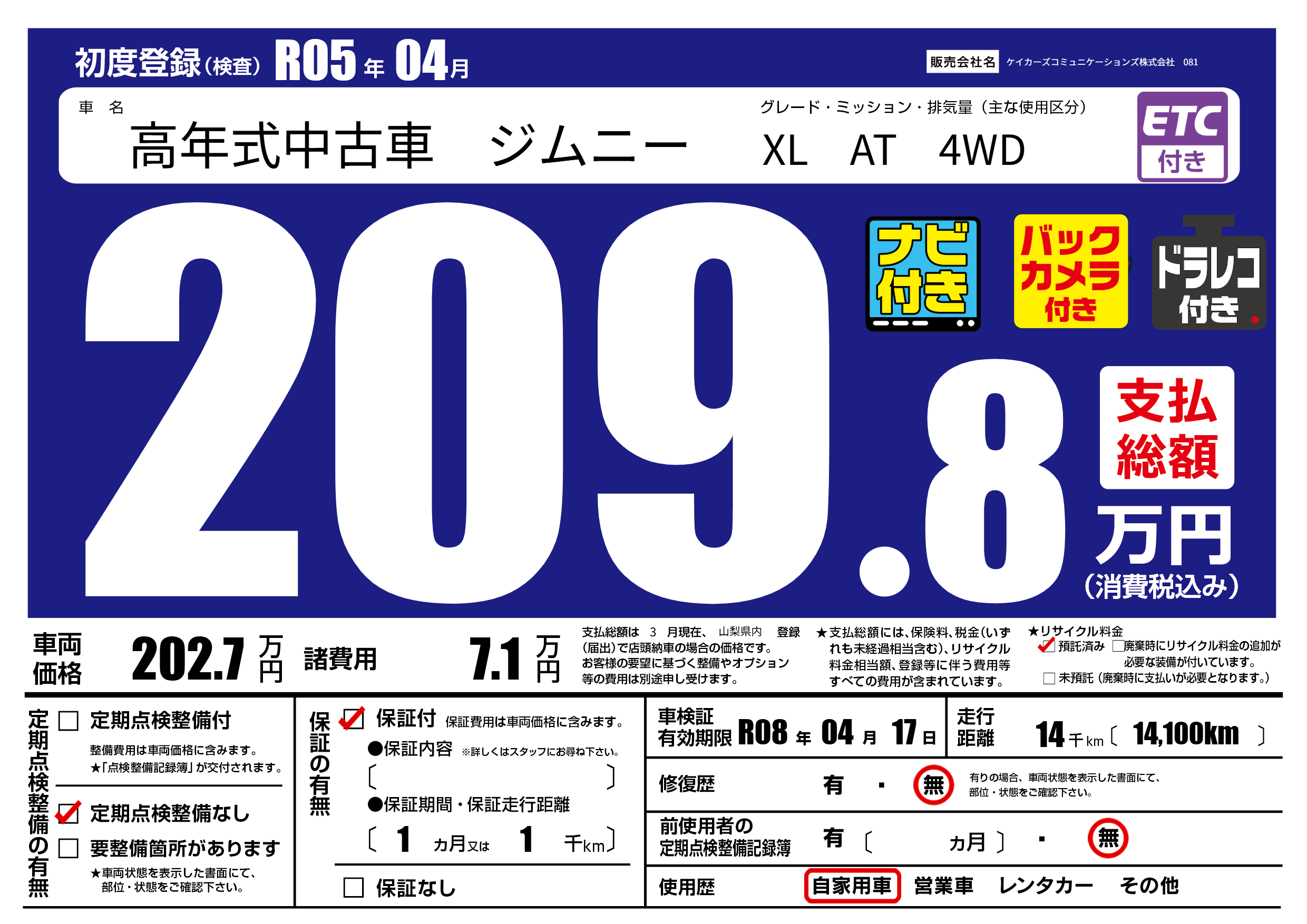 | 走行キロ | 1.4万km | 初年度登録 | R05年04月 |