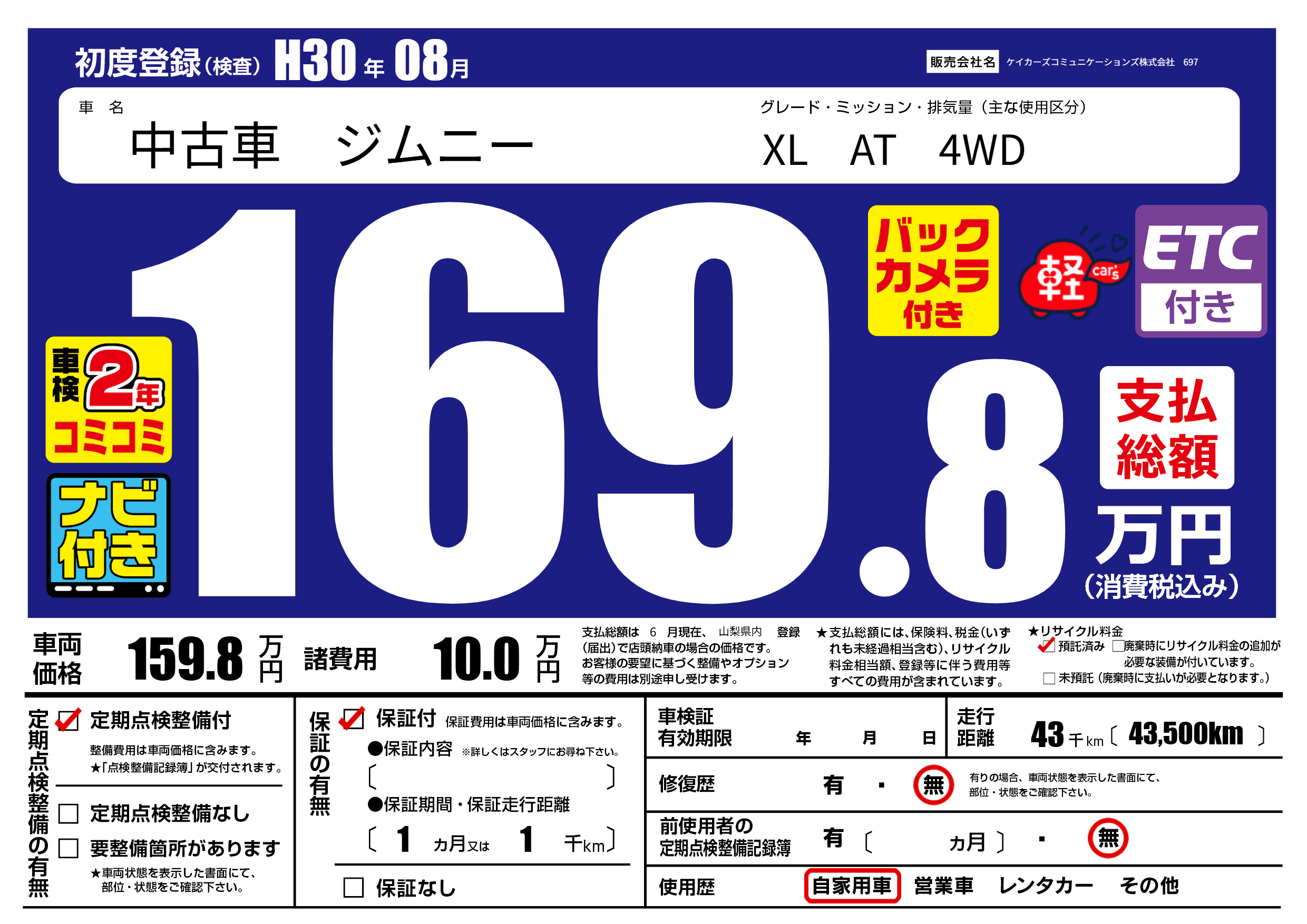 | 走行キロ | 4.3万km | 初年度登録 | H30年08月 |