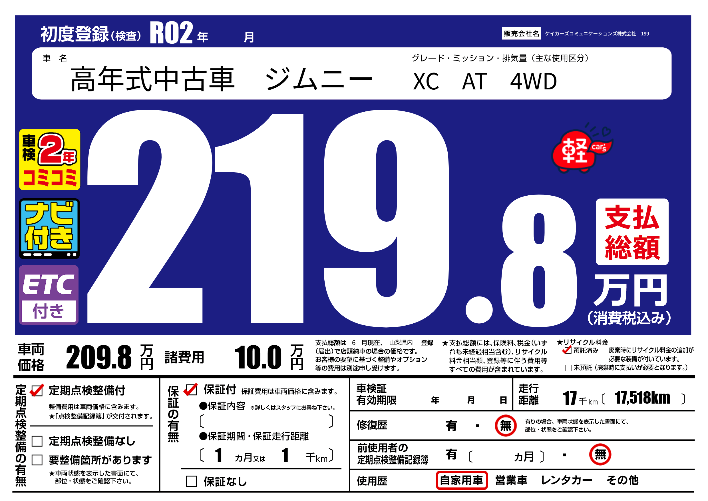 | 車名 | 高年式中古車 ジムニー | グレード ミッション 排気量 |