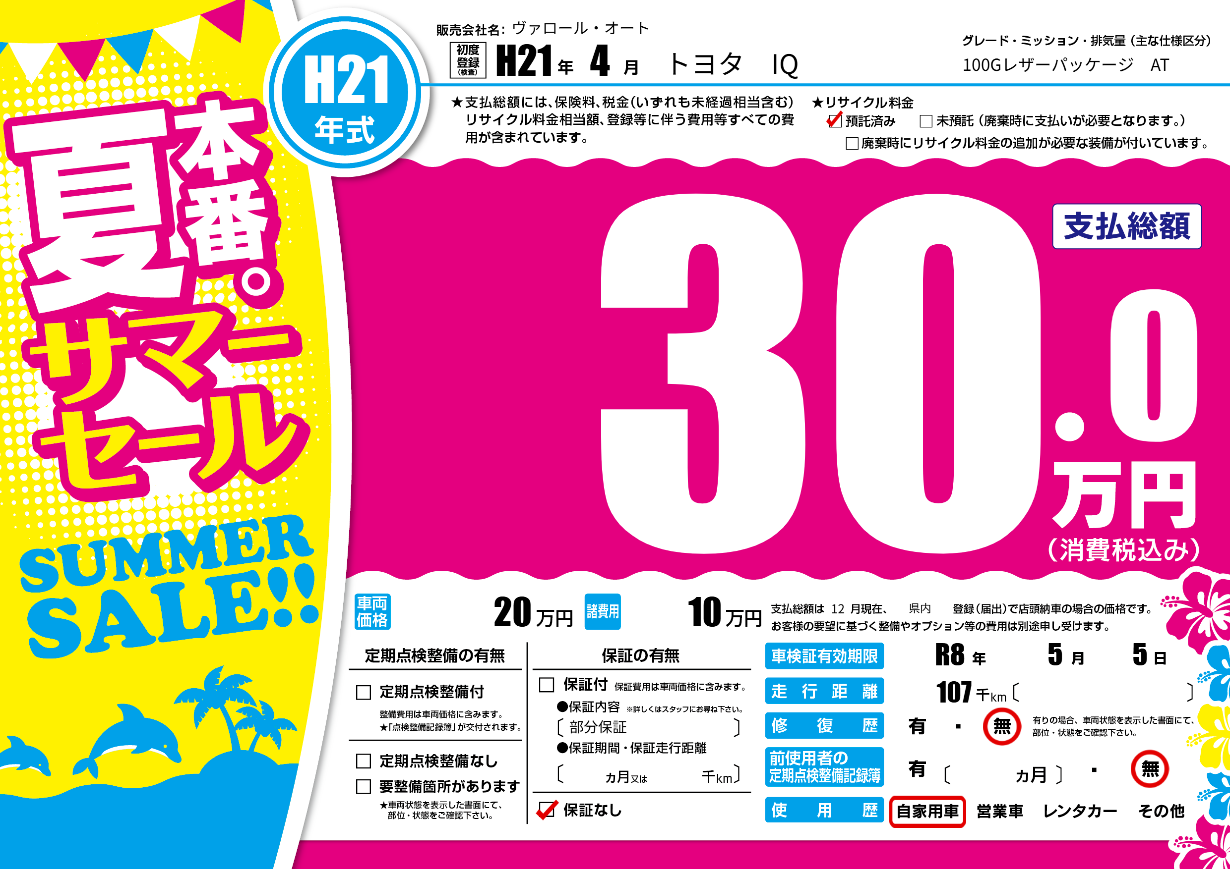 | 車名 | トヨタ IQ | グレード ミッション 排気量 |