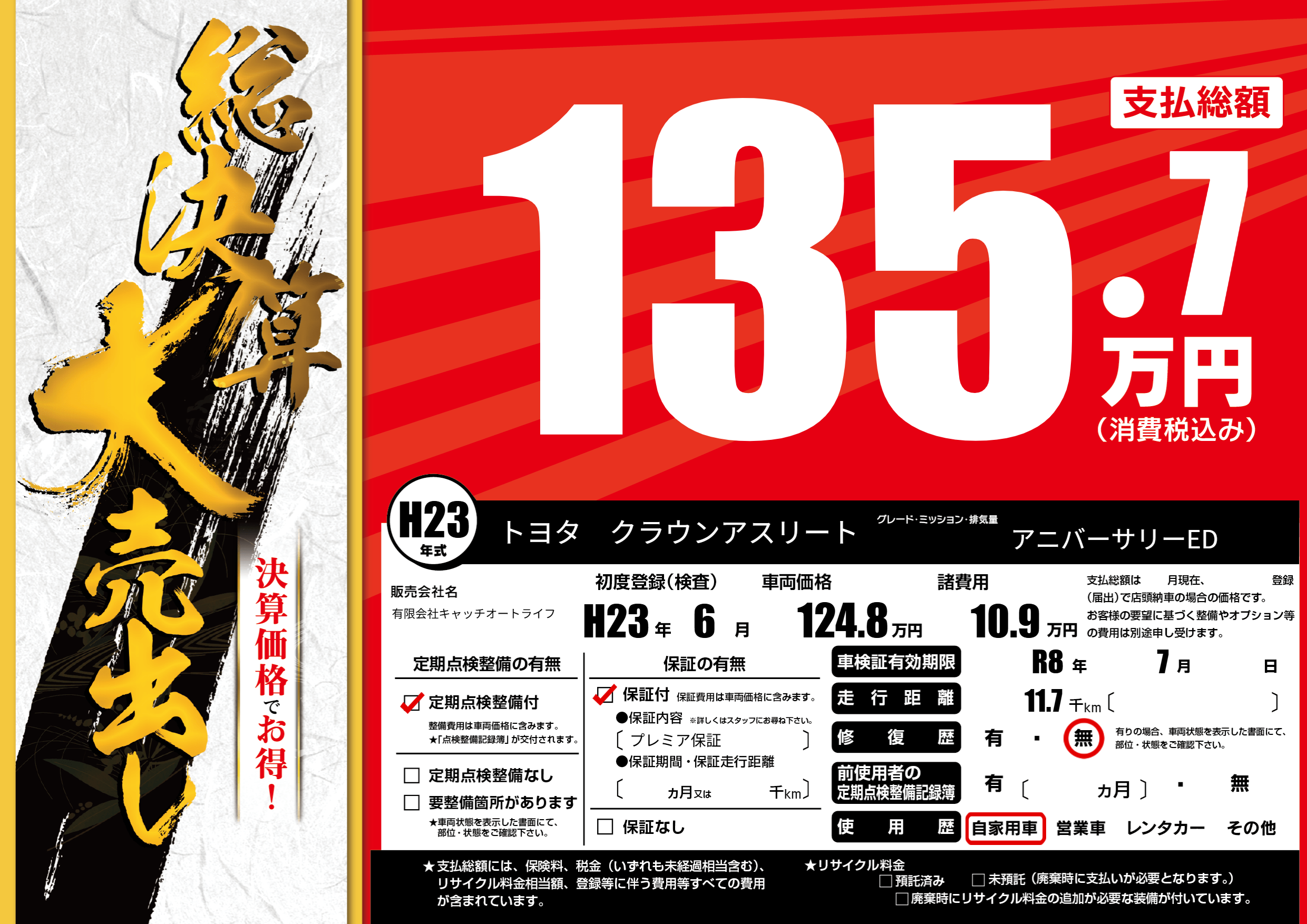 | 走行キロ | 1.1万km | 初年度登録 | H23年6月 |