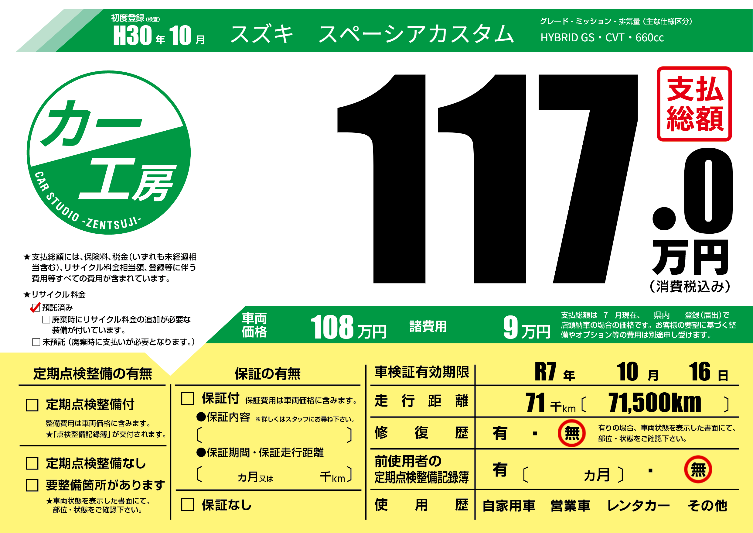 | 車名 | スズキ スペーシアカスタム | グレード ミッション 排気量 |