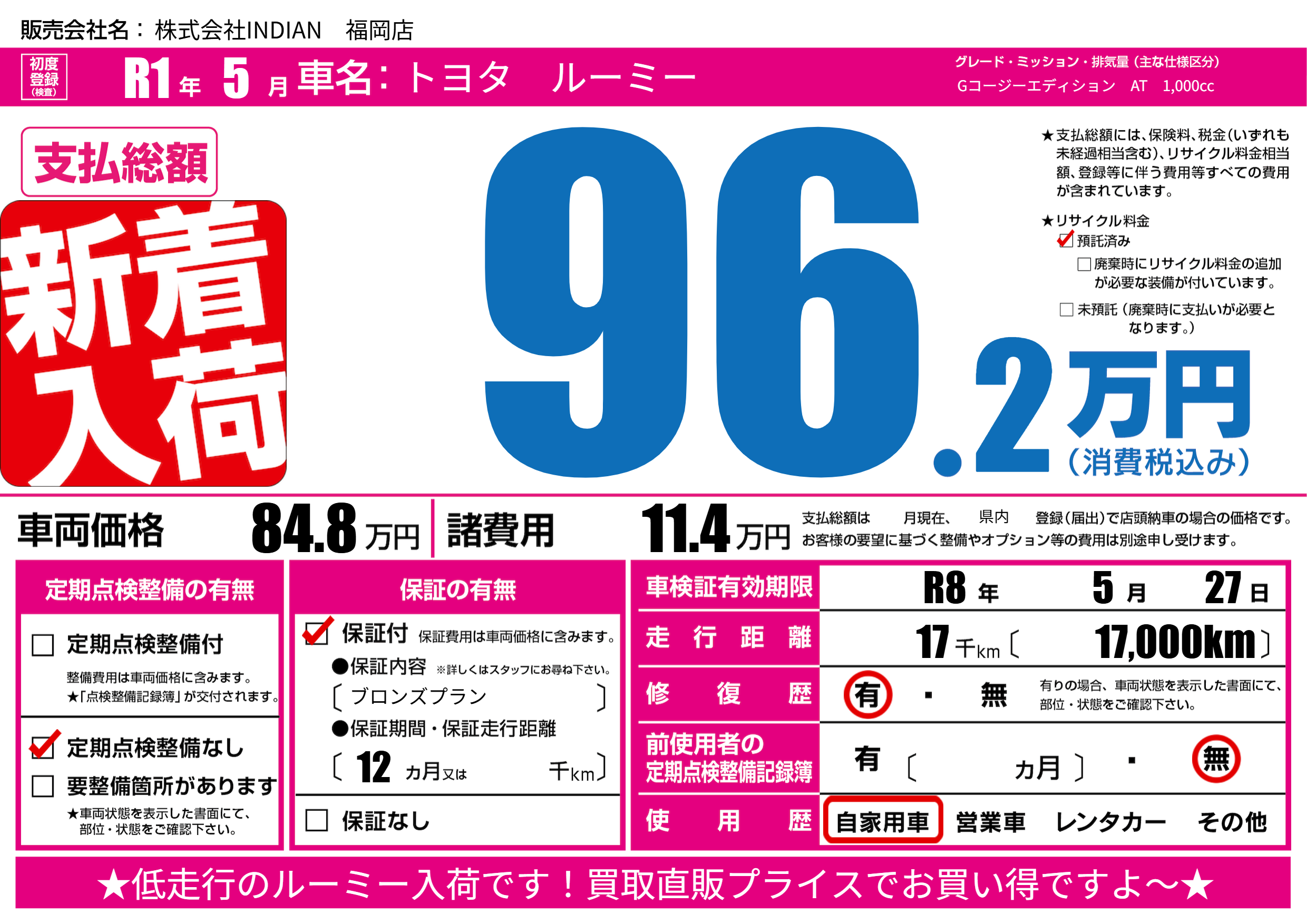 | 車名 | トヨタ ルーミー | グレード ミッション 排気量 |