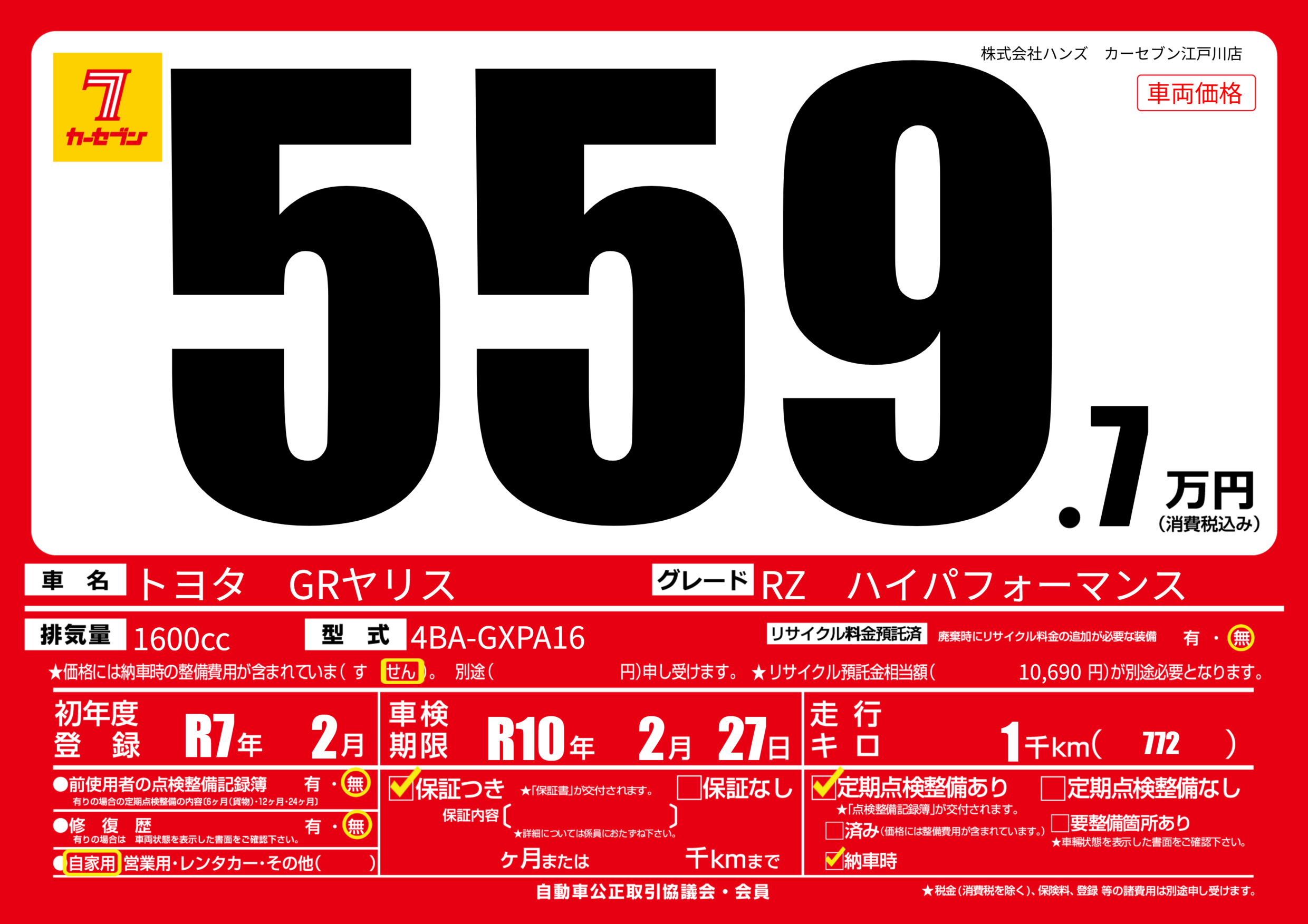 | 車名 | トヨタ GRヤリス | グレード ミッション 排気量 |