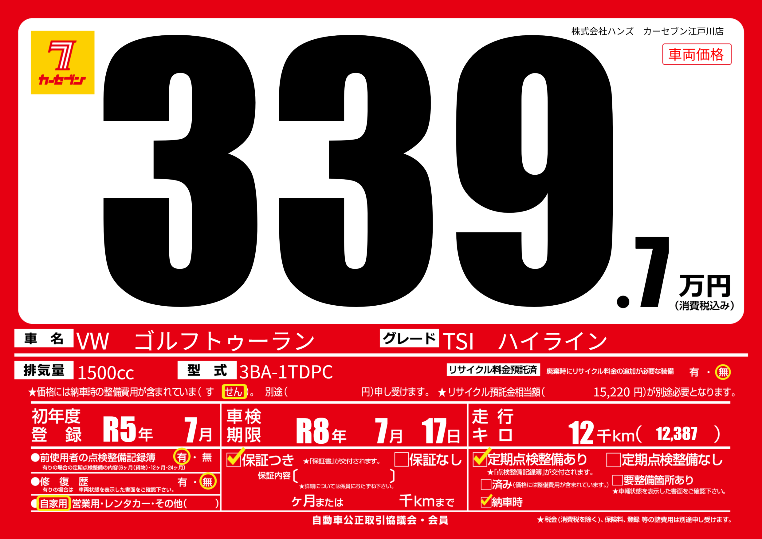 | 走行キロ | 1.2万km | 初年度登録 | R5年7月 |