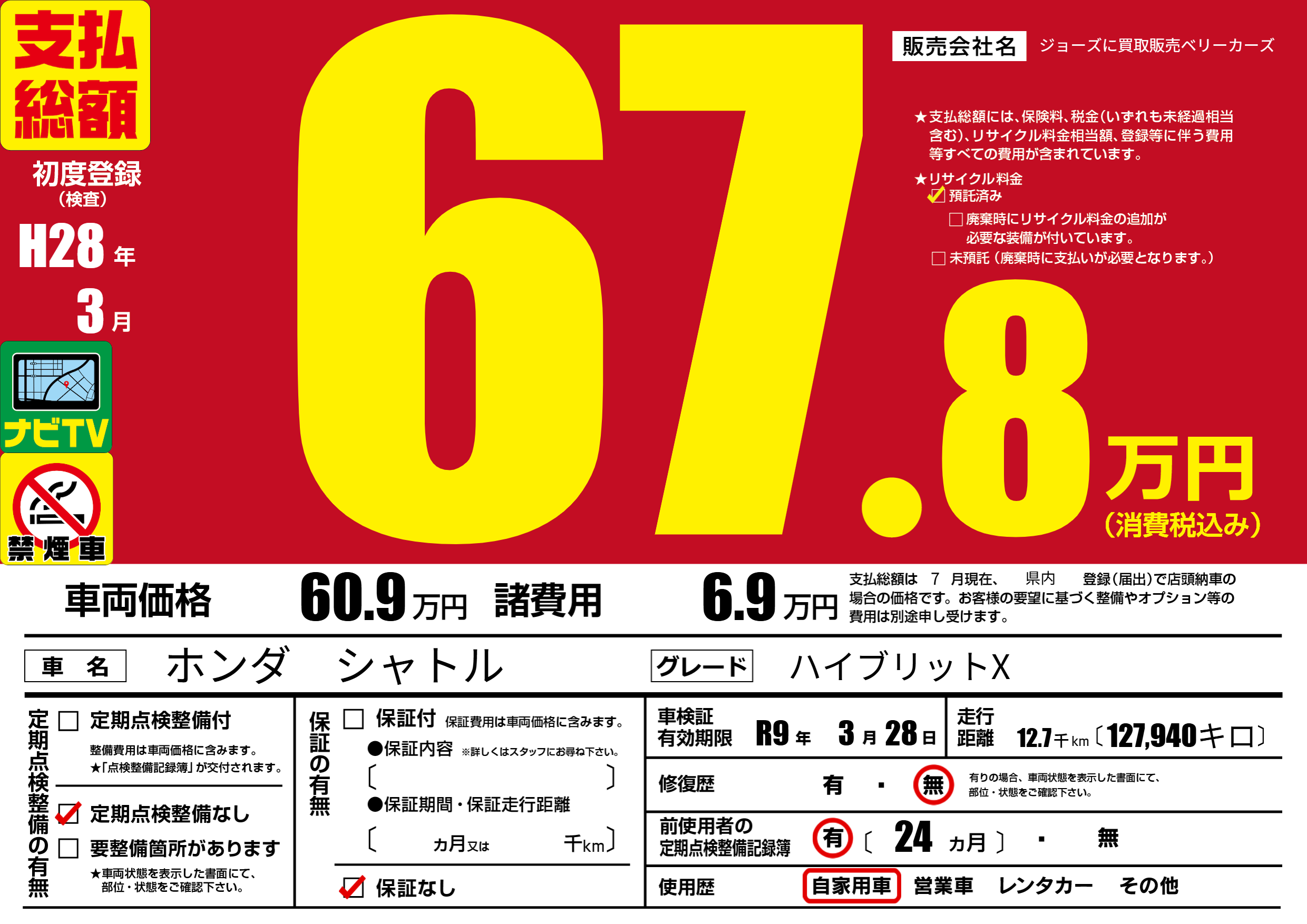| 車名 | ホンダ シャトル | グレード ミッション 排気量 |