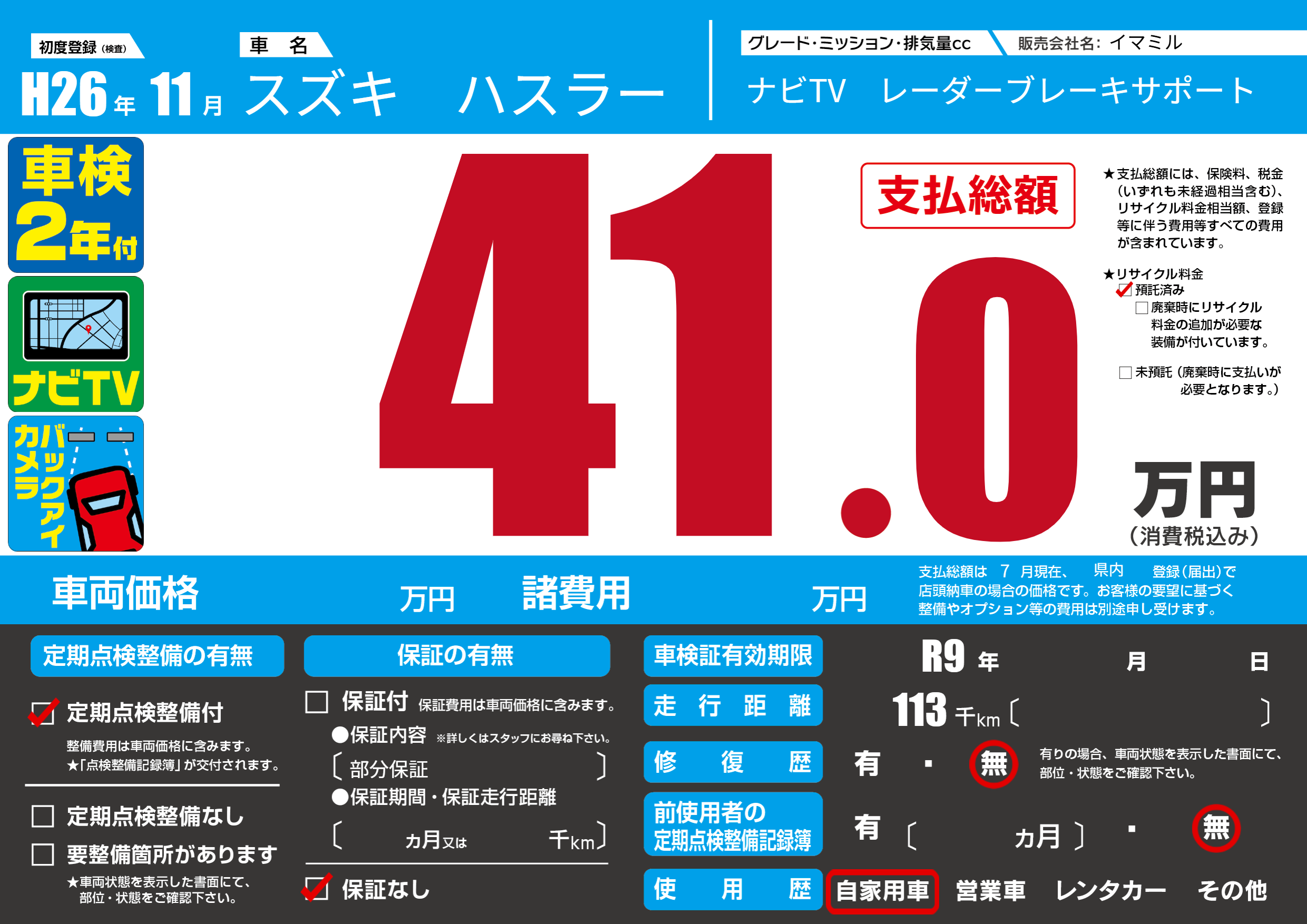 | 走行キロ | 11.3万km | 初年度登録 | H26年11月 |