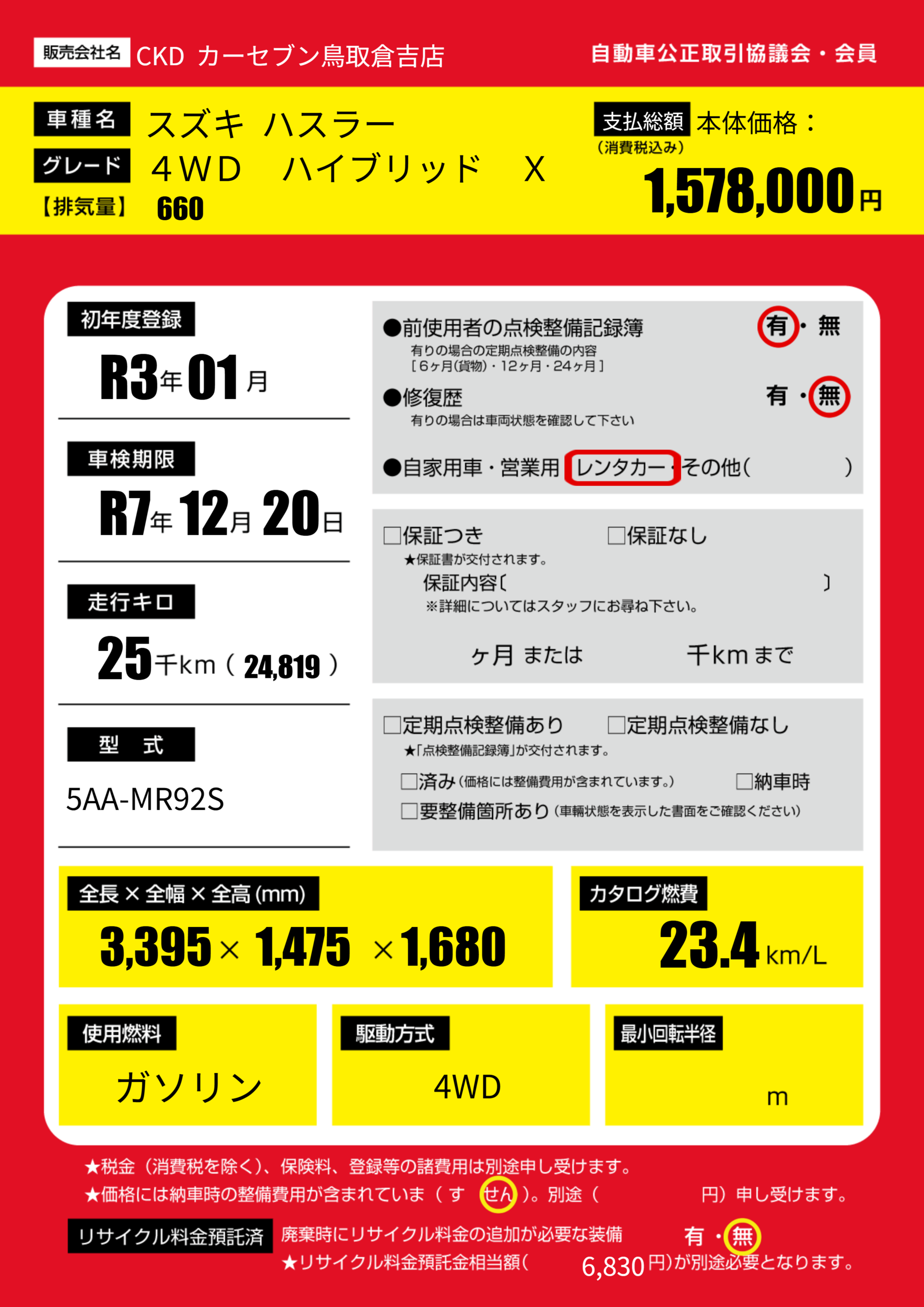 | 車名 | スズキ ハスラー | グレード ミッション 排気量 |