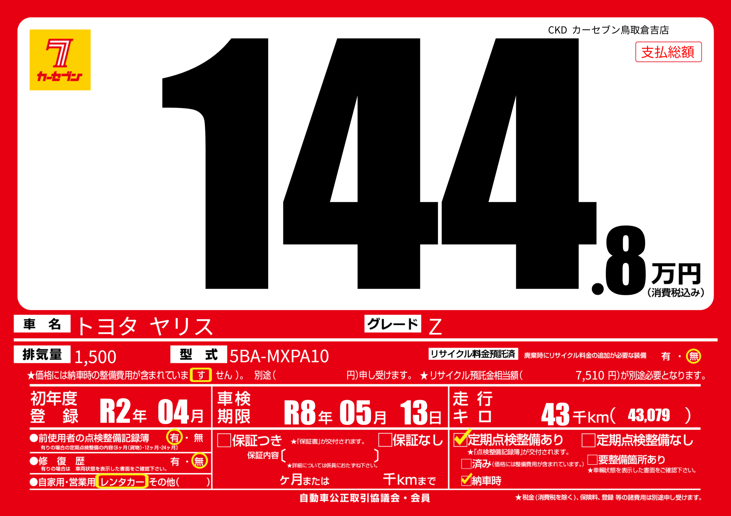 | 定期点検整備 | 定期点検整備あり 納車時あり | ||