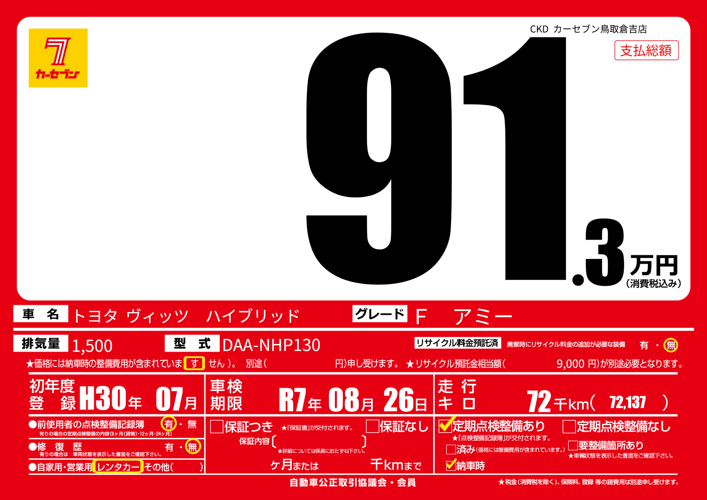 | 車名 | トヨタ ヴィッツ ハイブリッド | グレード ミッション 排気量 |