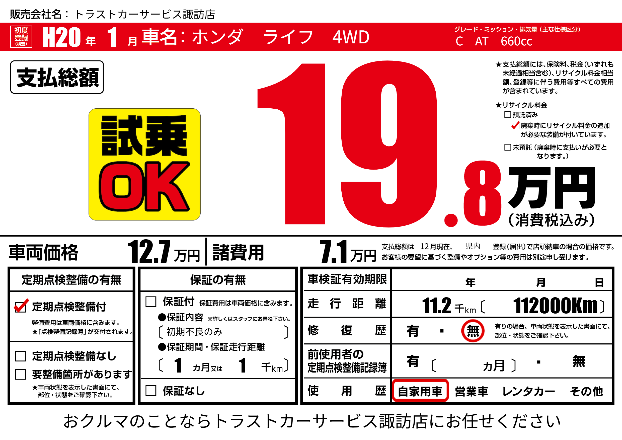 | 車名 | ホンダ ライフ 4WD | グレード ミッション 排気量 |