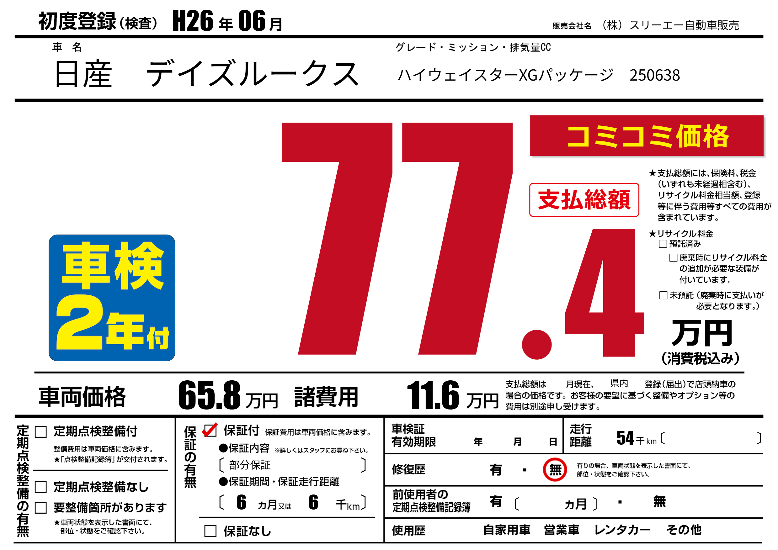 | 走行キロ | 5.4万km | 初年度登録 | H26年06月 |