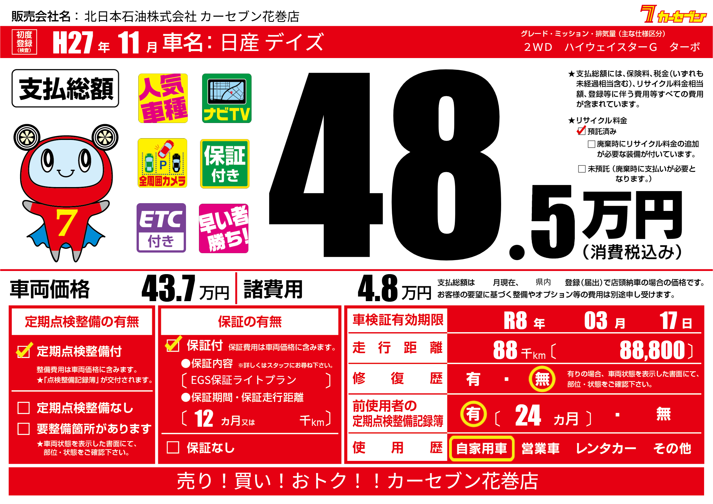 | 走行キロ | 8.8万km | 初年度登録 | H27年11月 |