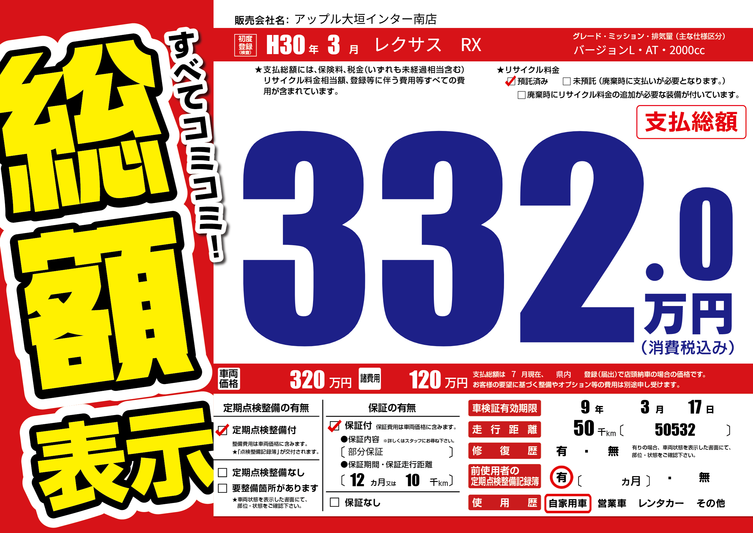 | 車名 | レクサス RX | グレード ミッション 排気量 |