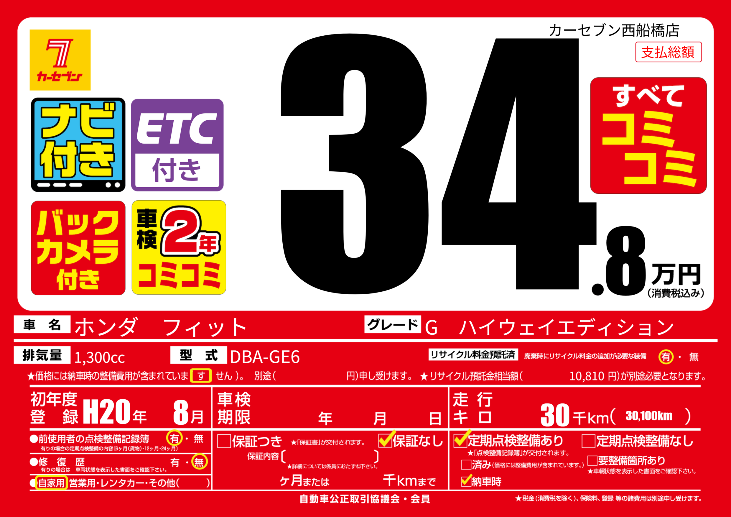 | 走行キロ | 3万km | 初年度登録 | H20年8月 |