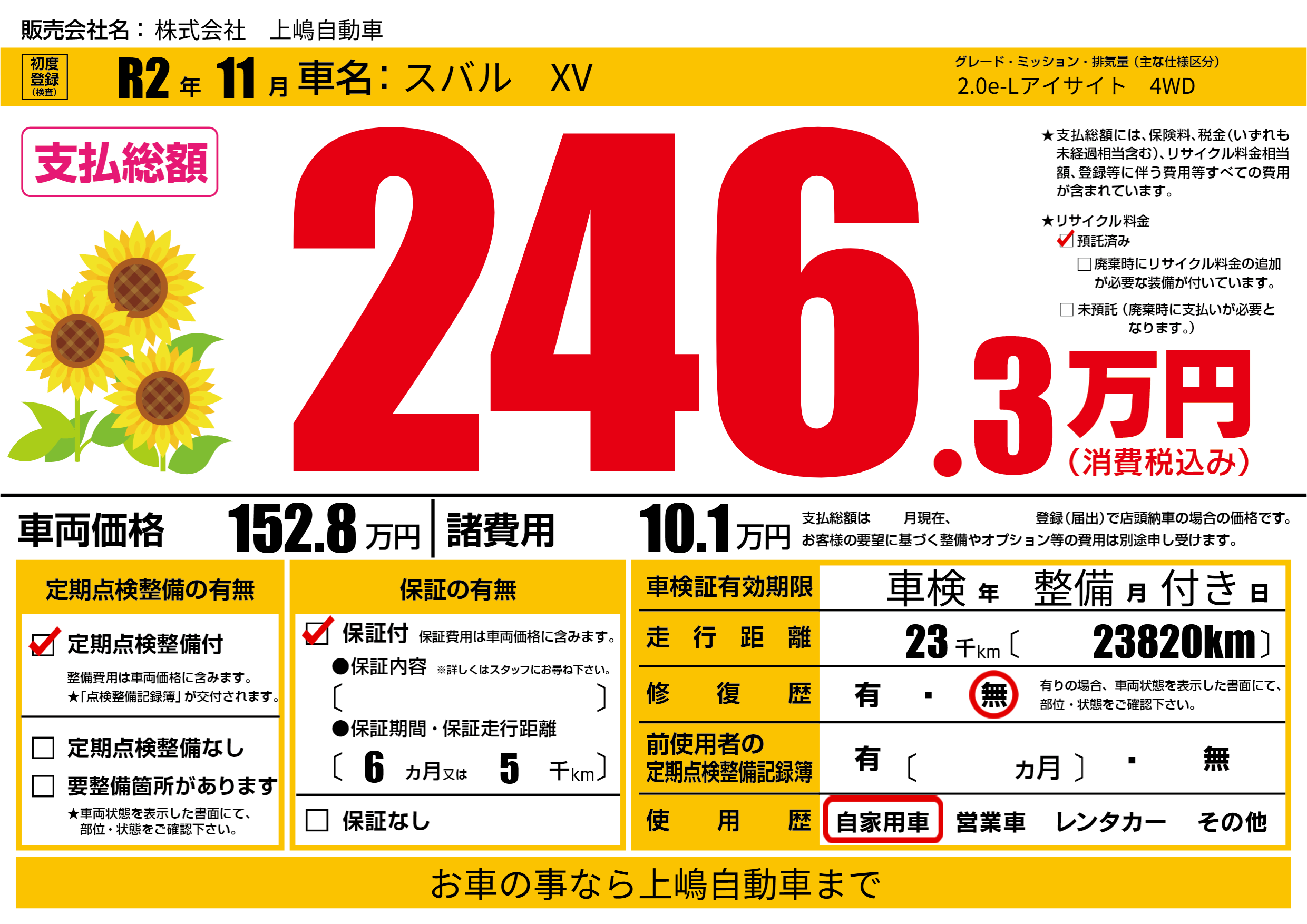 | 車名 | スバル XV | グレード ミッション 排気量 |