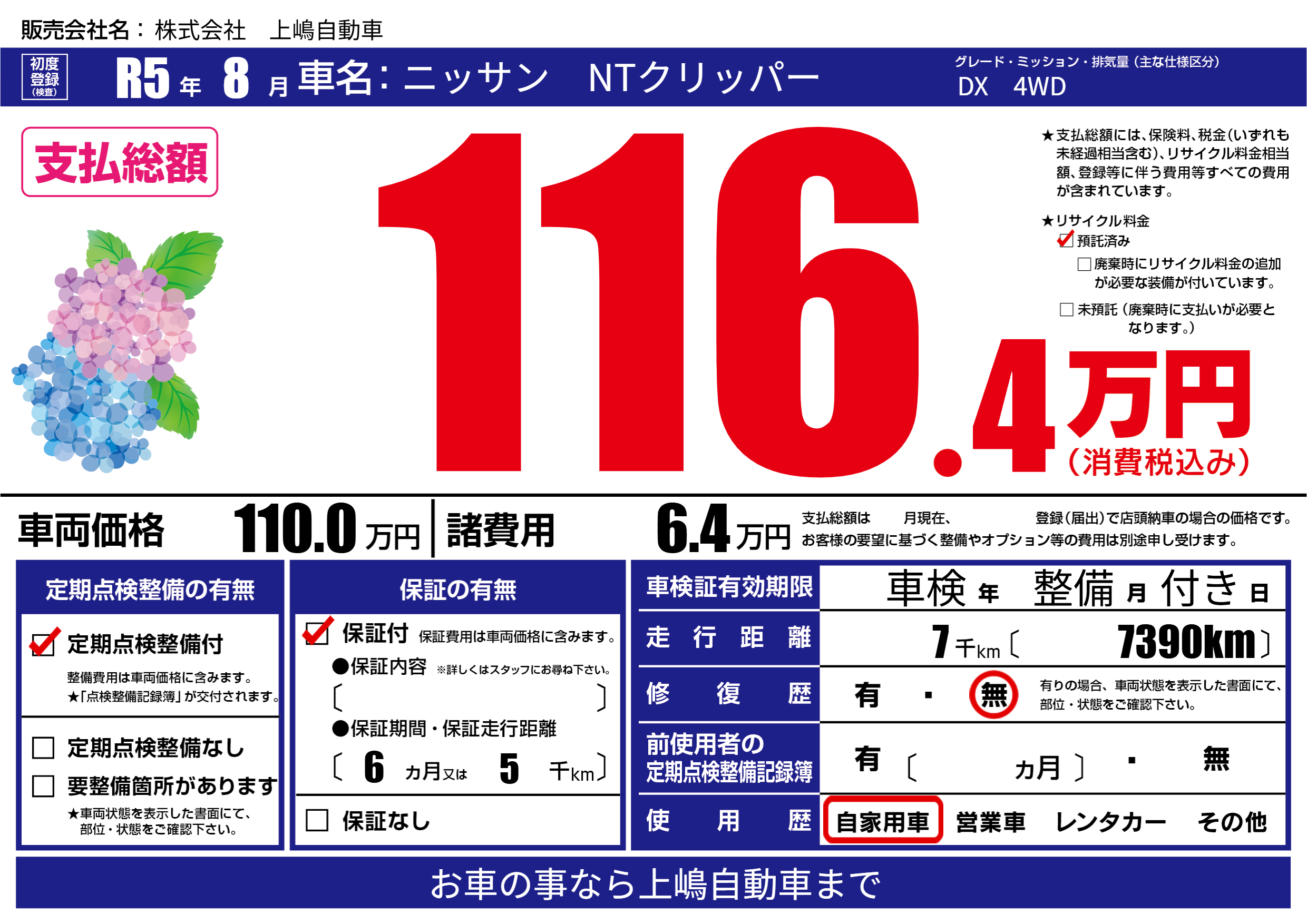 保証付き 保証内容(---) 6ヶ月または(5)千kmまで |