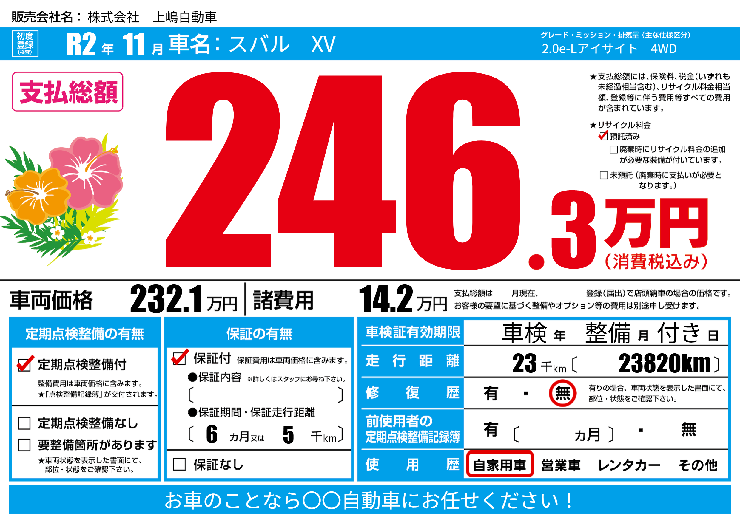 | 車名 | スバル XV | グレード ミッション 排気量 |