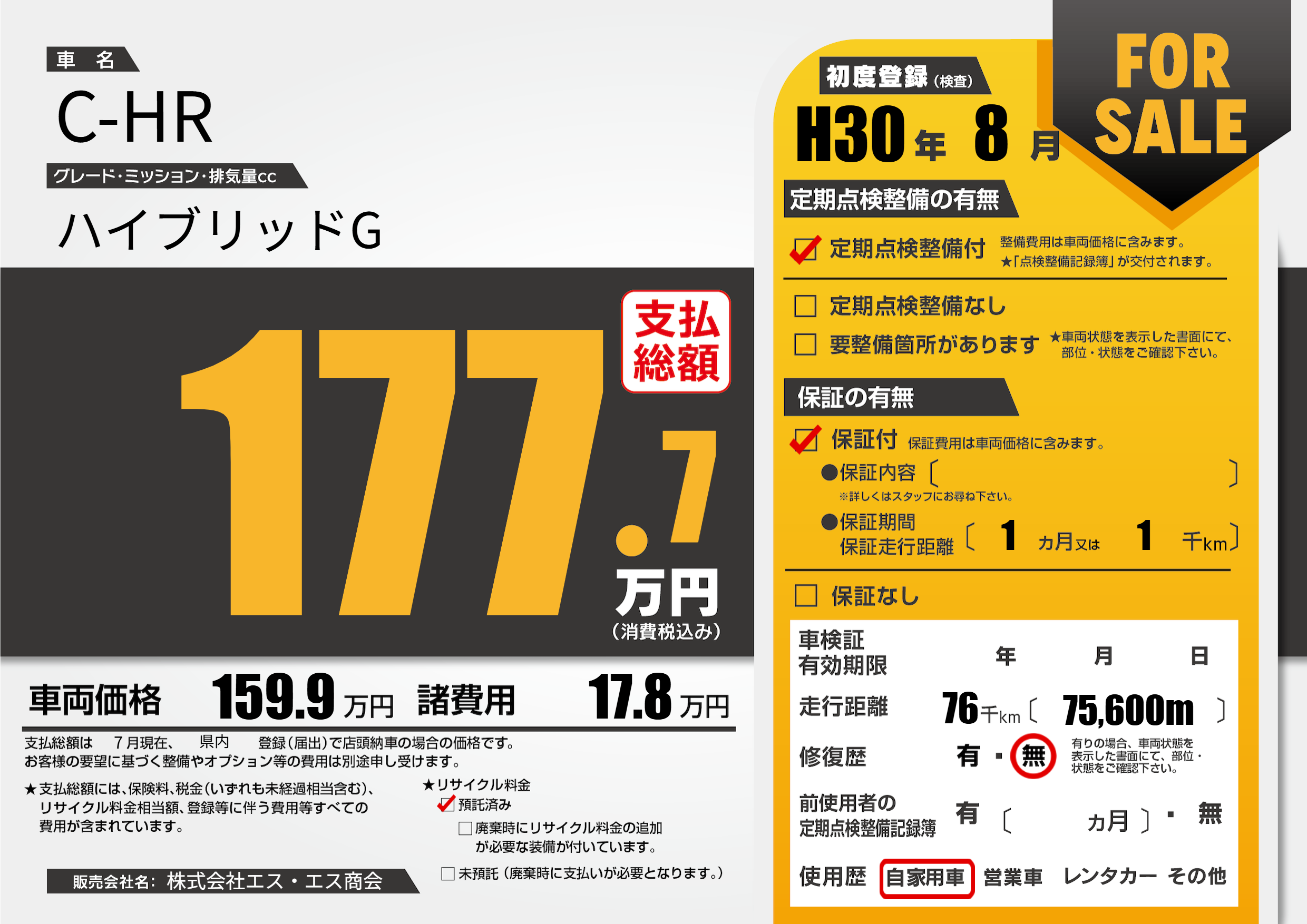 | 走行キロ | 7.6万km | 初年度登録 | H30年8月 |