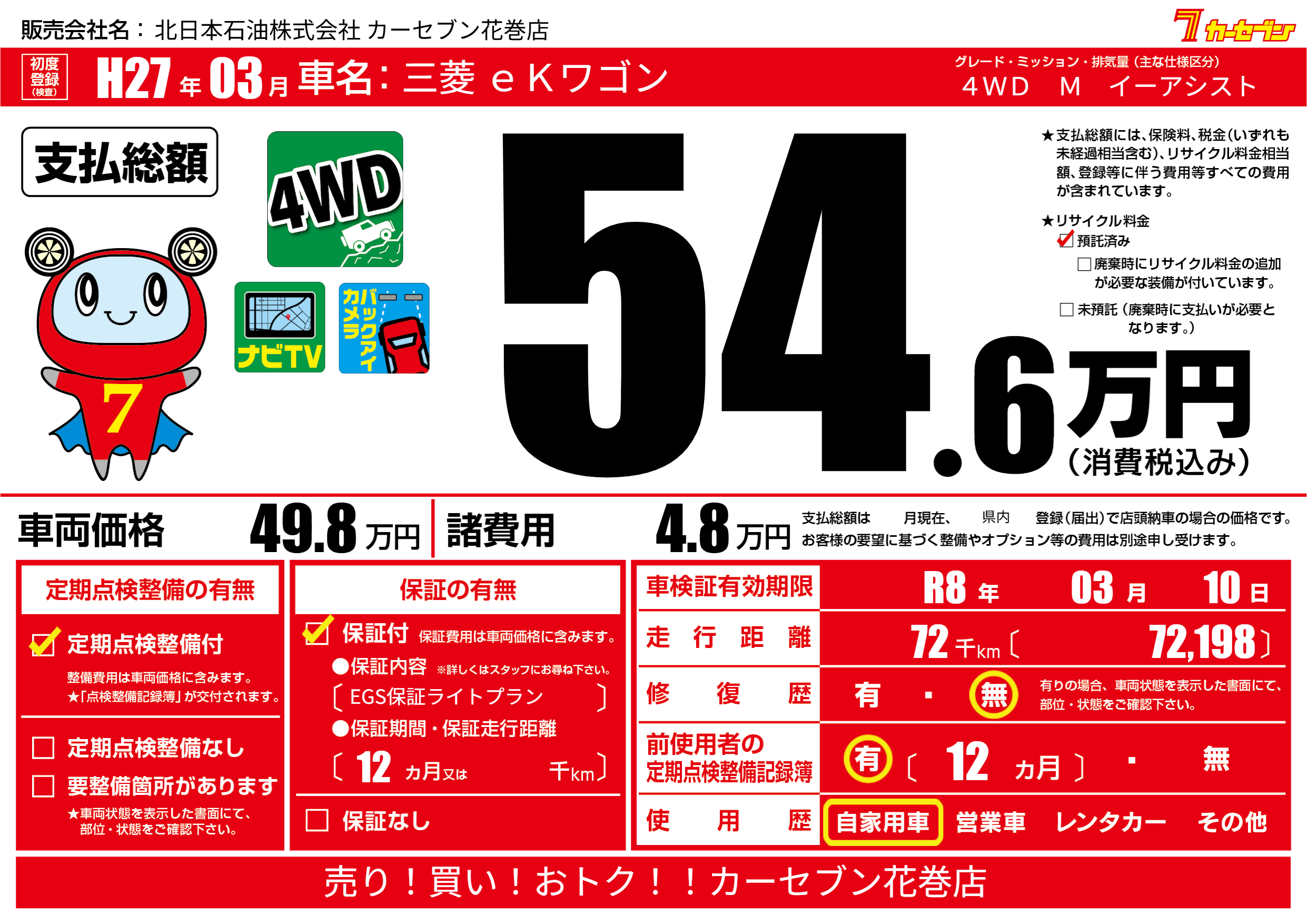 | 走行キロ | 7.2万km | 初年度登録 | H27年03月 |