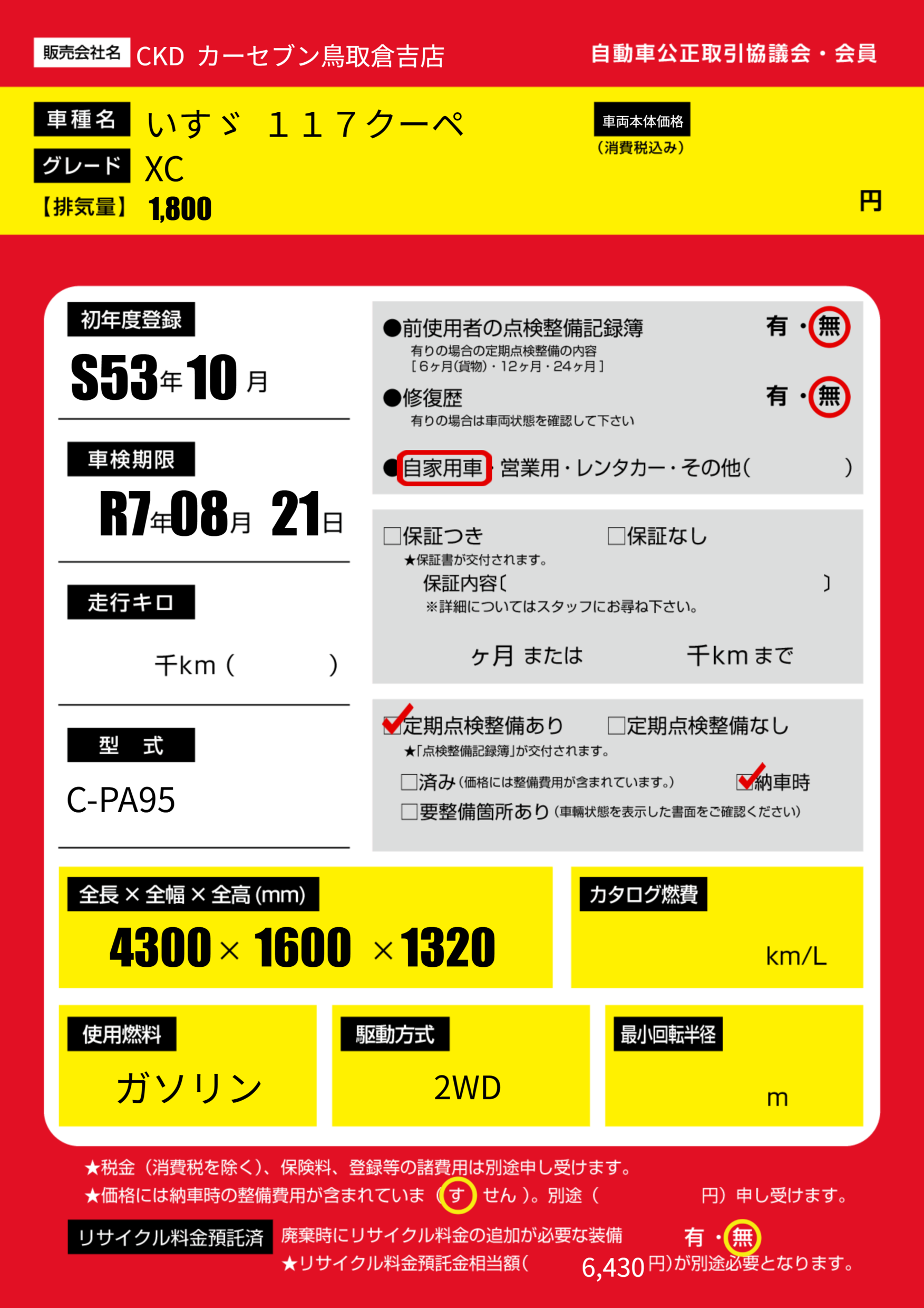 | 走行キロ | - | 初年度登録 | S53年10月 |