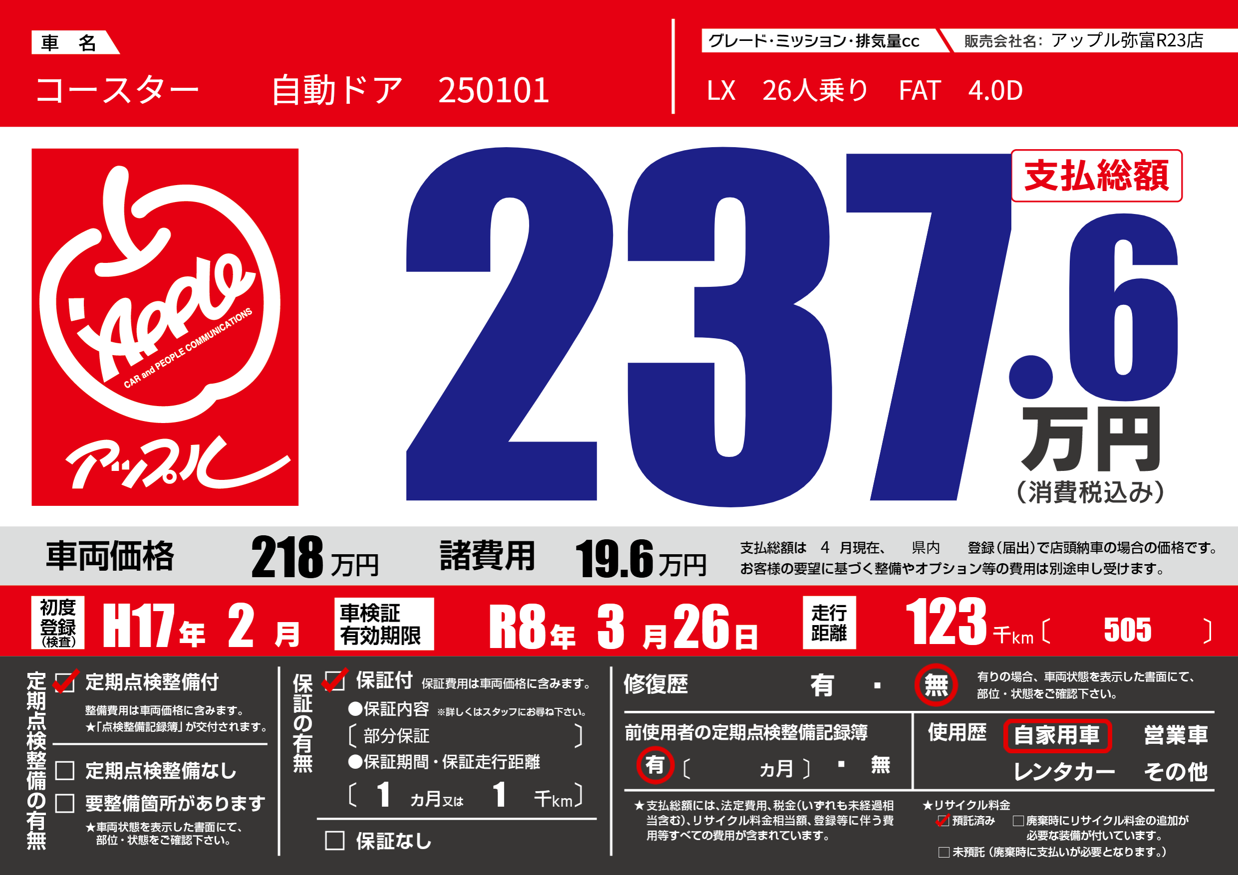 | 車名 | コースター 自動ドア 250101 | グレード ミッション 排気量 |
