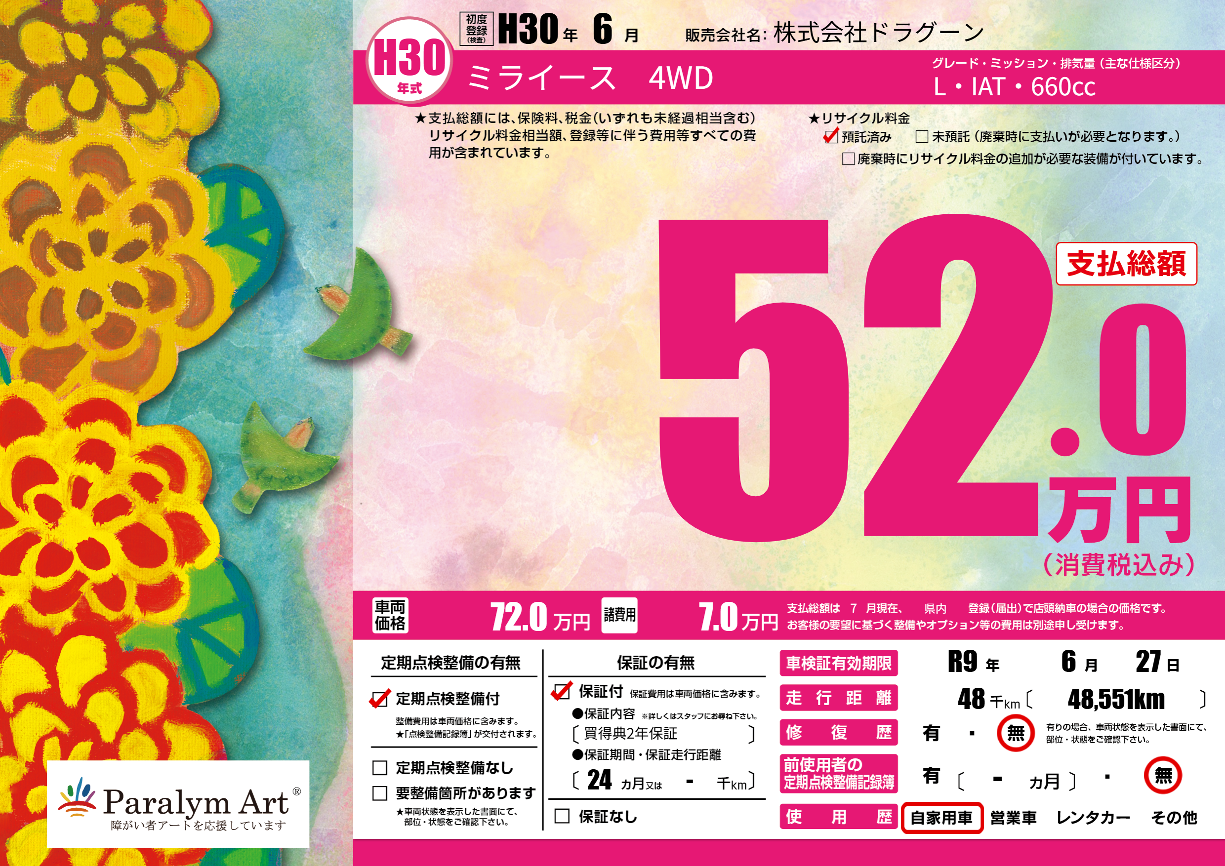 | 車名 | ミライース 4WD | グレード ミッション 排気量 |