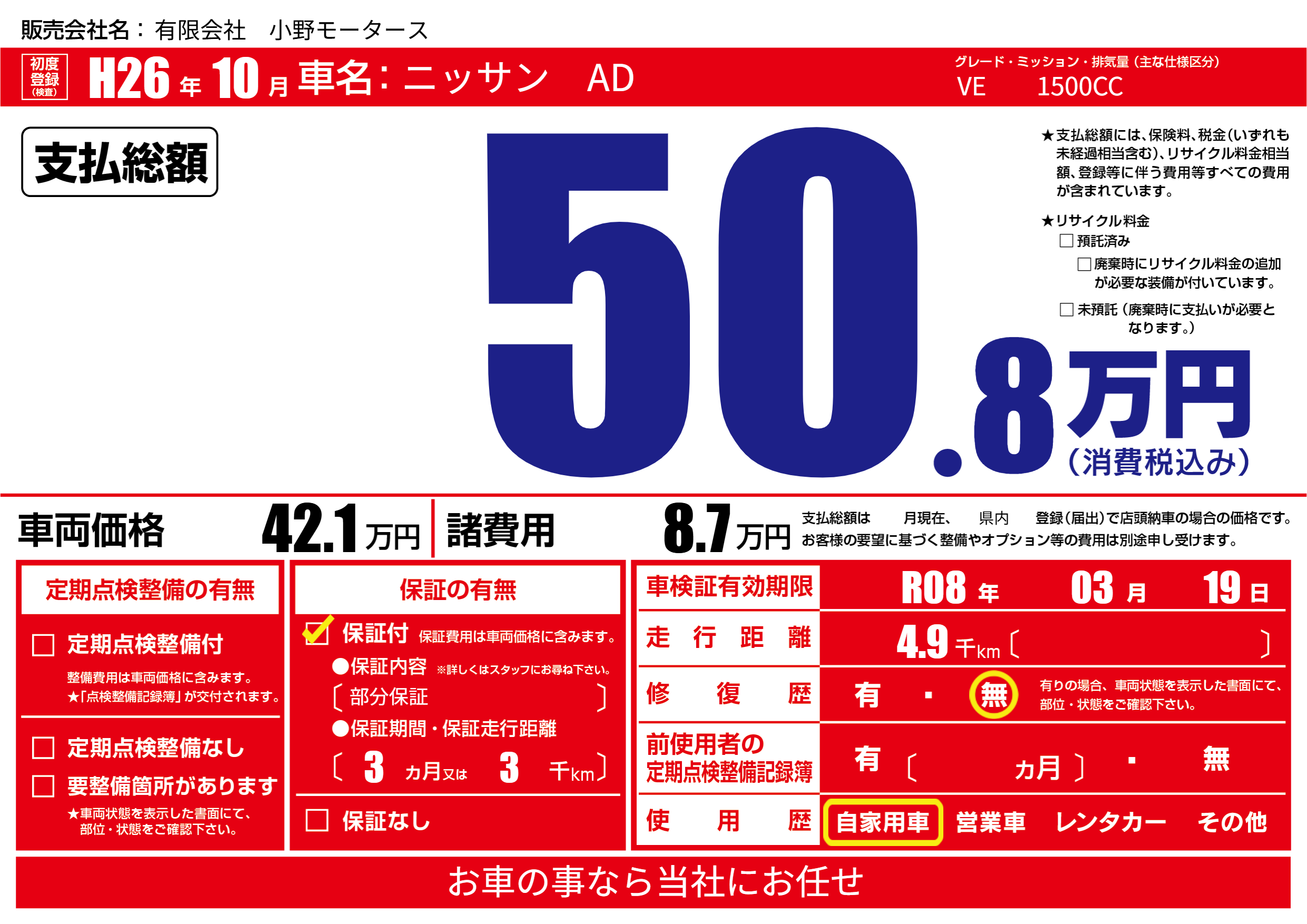 | 車名 | ニッサン AD | グレード ミッション 排気量 |