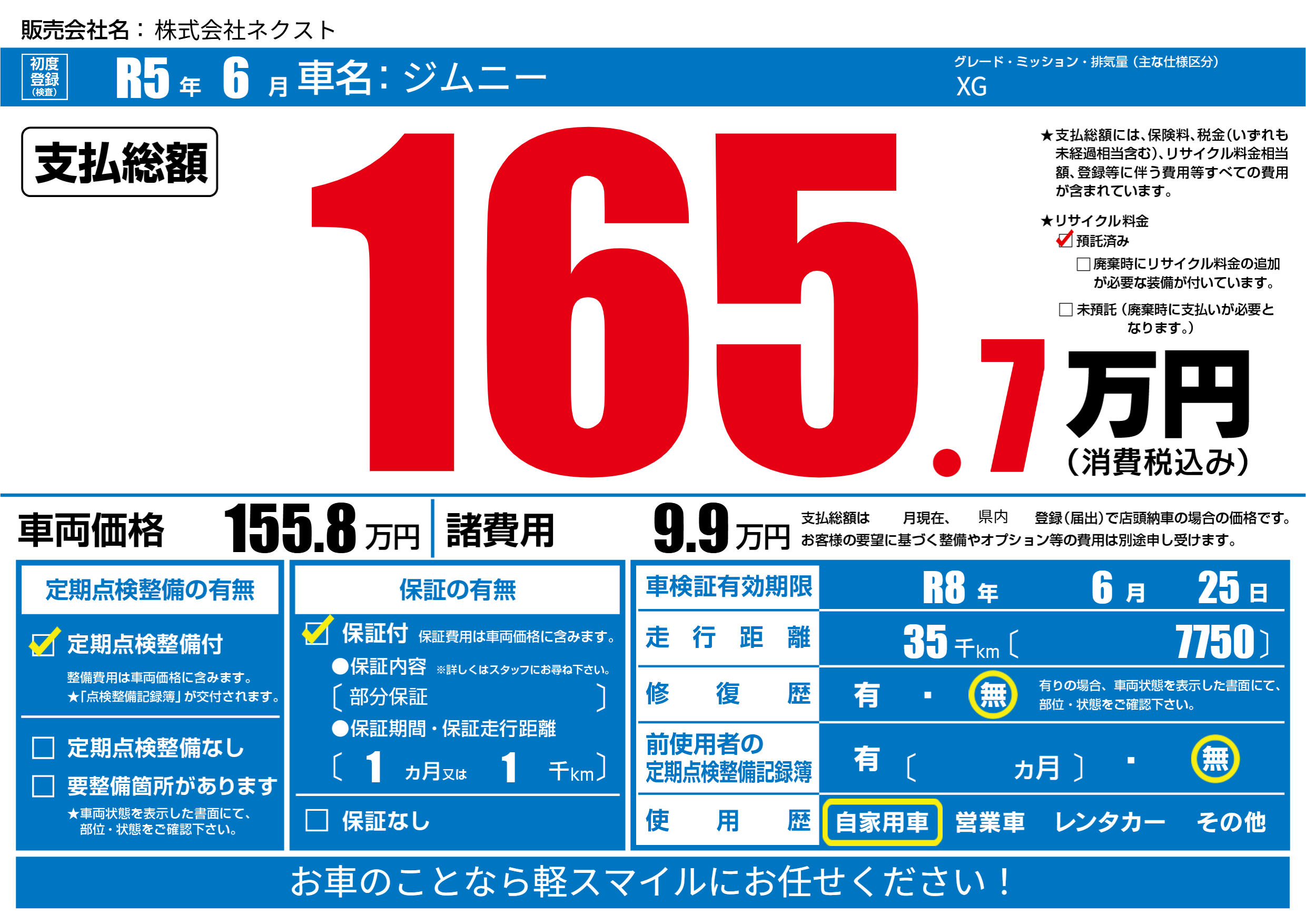 | 車名 | ジムニー | グレード ミッション 排気量 |