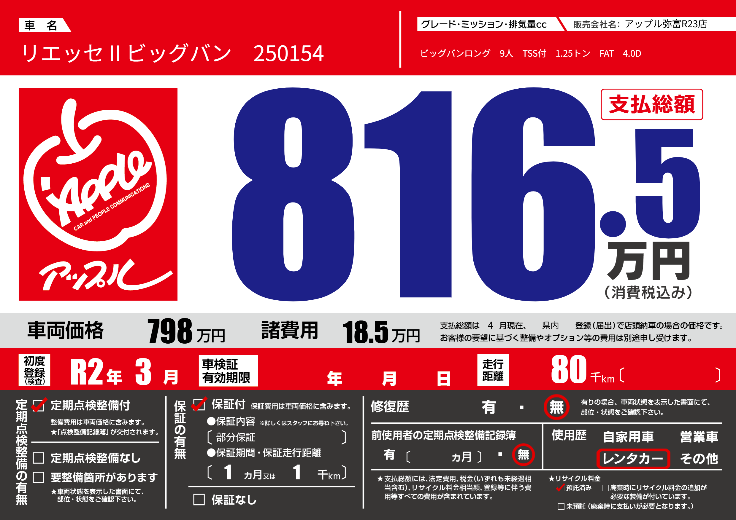 | 車名 | リエッセⅡビッグバン 250154 | グレード ミッション 排気量 |