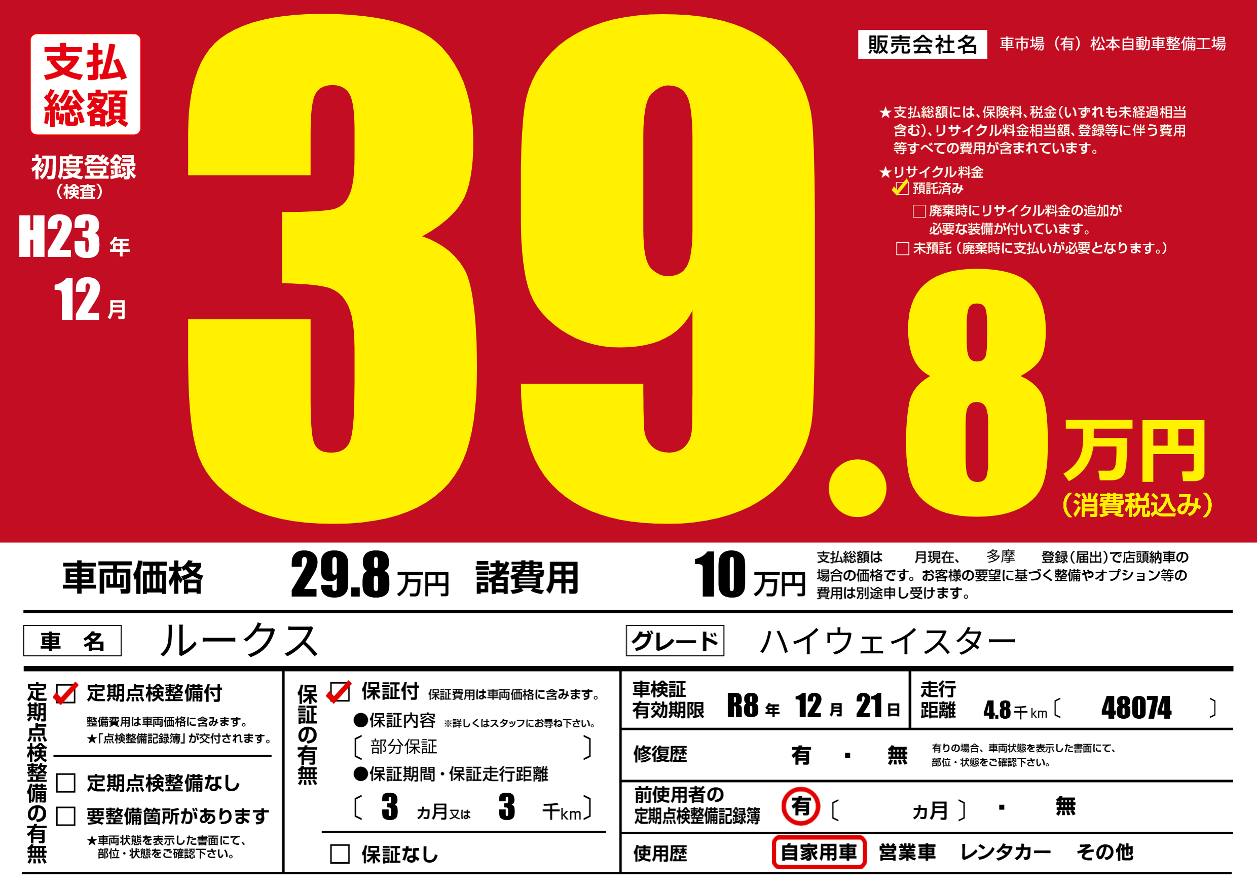| 定期点検整備 | 定期点検整備あり | ||