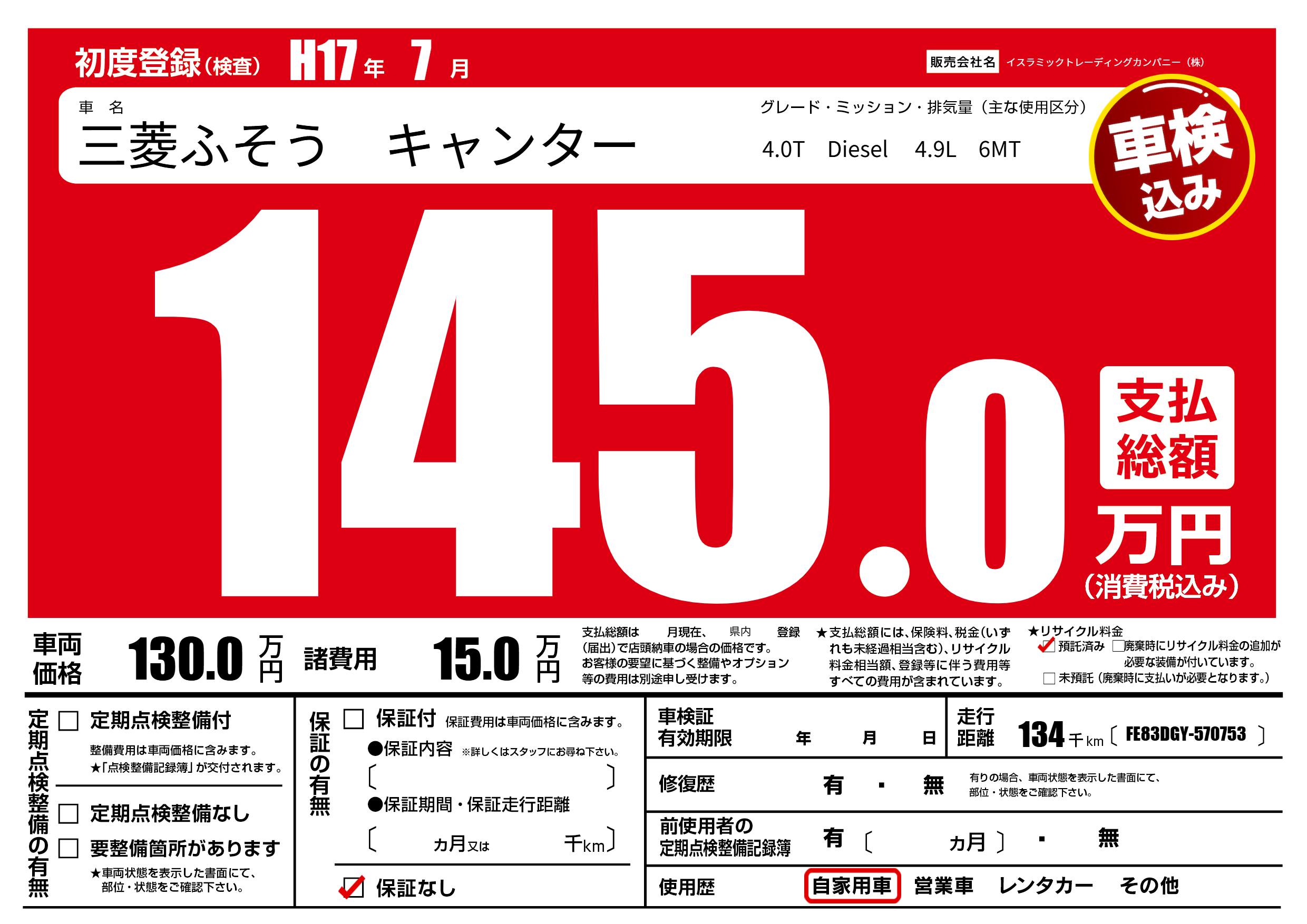 | 車名 | 三菱ふそう キャンター | グレード ミッション 排気量 |