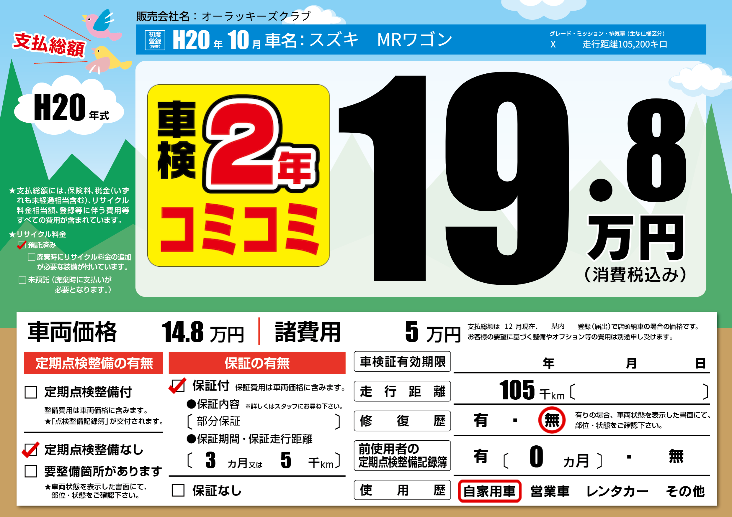 | 走行キロ | 10.5万km | 初年度登録 | H20年10月 |