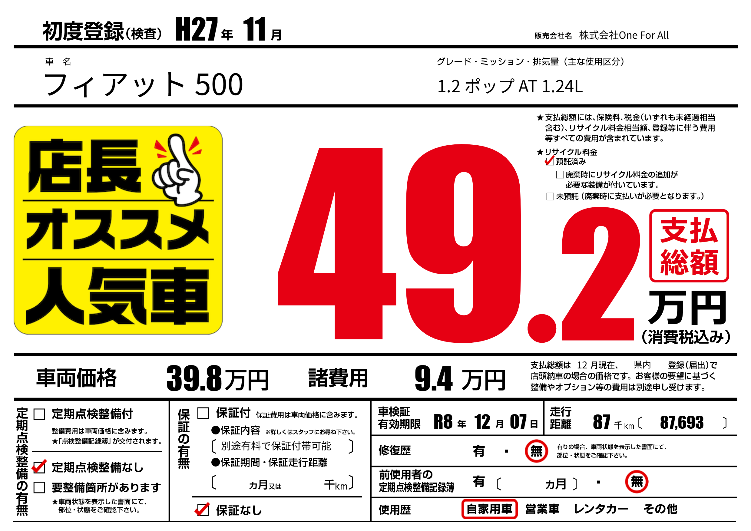 | 車名 | フィアット 500 | グレード ミッション 排気量 |