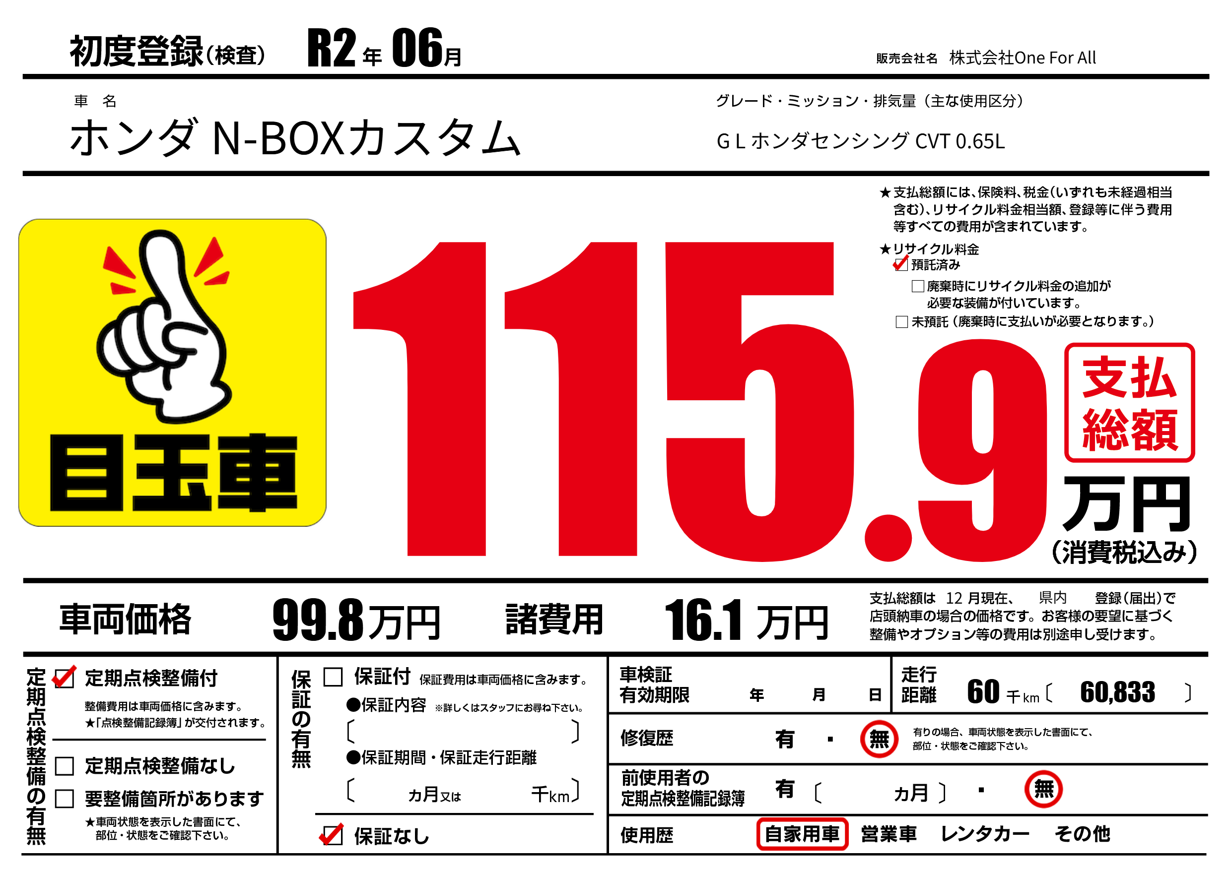 | 走行キロ | 6万km | 初年度登録 | R2年06月 |