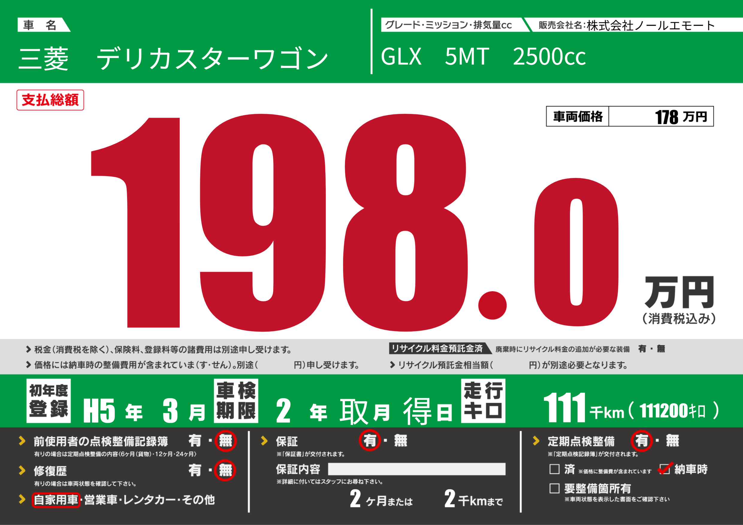 | 走行キロ | 11.1万km | 初年度登録 | H5年3月 |