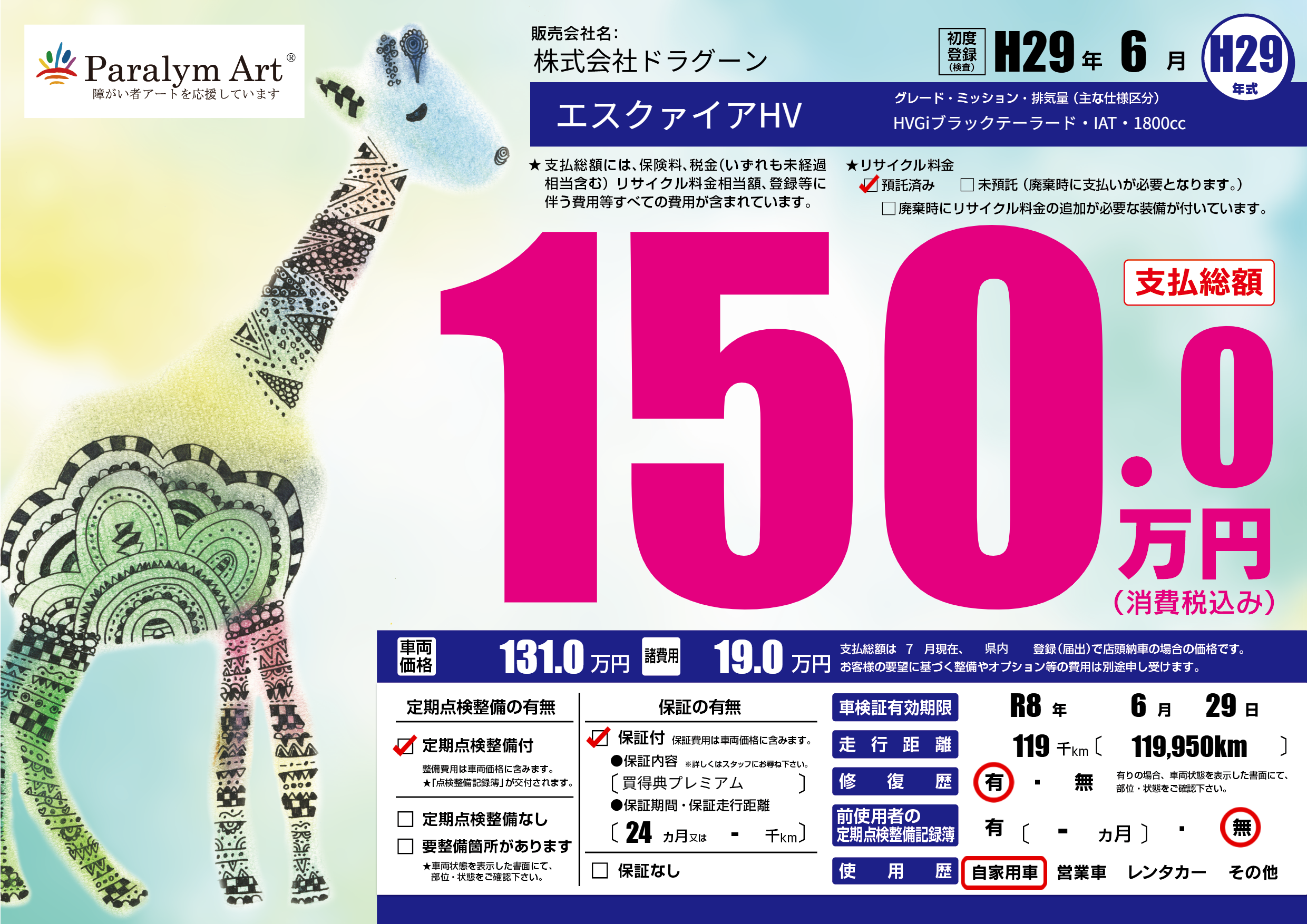 | 走行キロ | 11.9万km | 初年度登録 | H29年6月 |