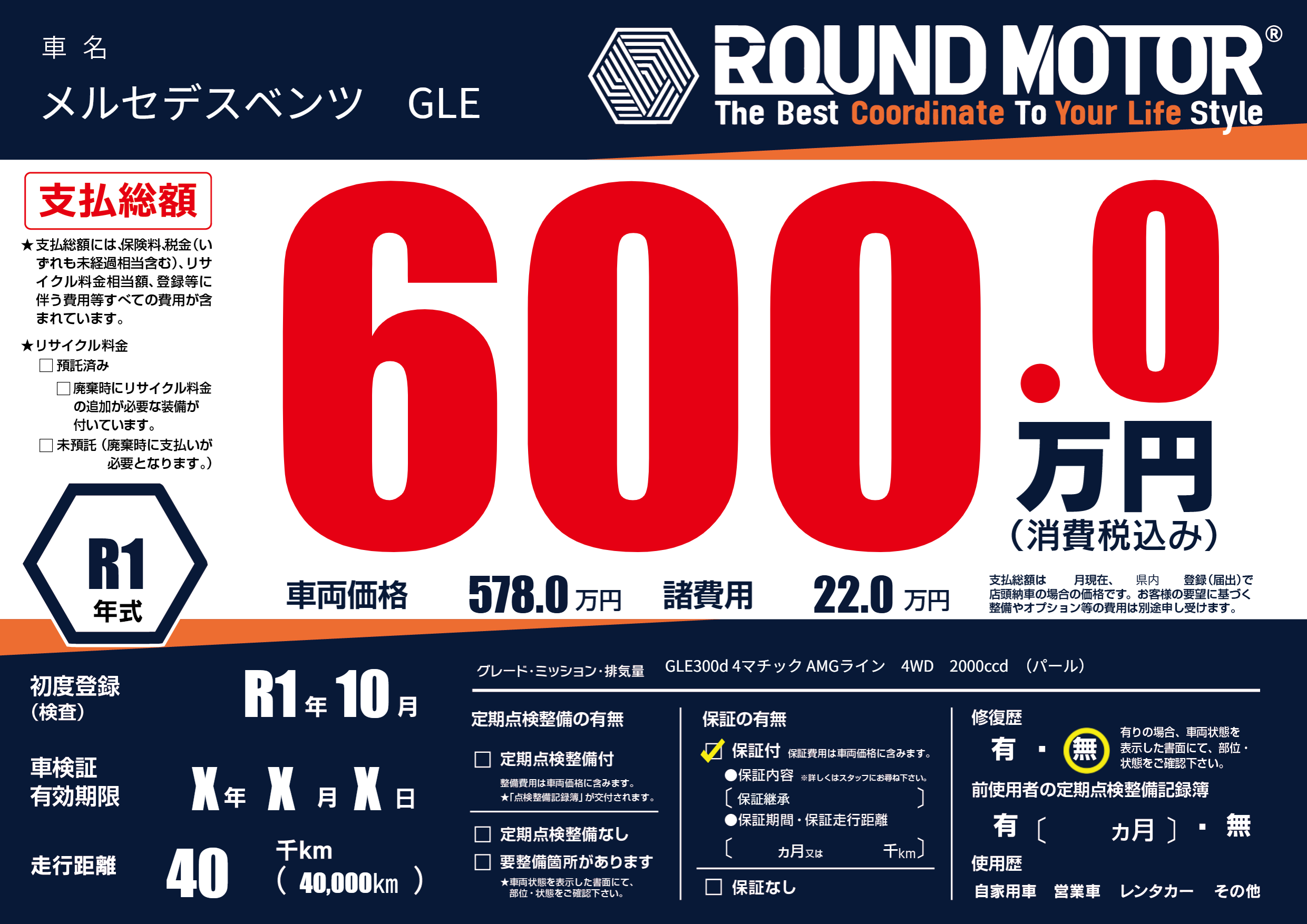 GLE300d 4マチック AMGライン 4WD 2000ccd (パール) |