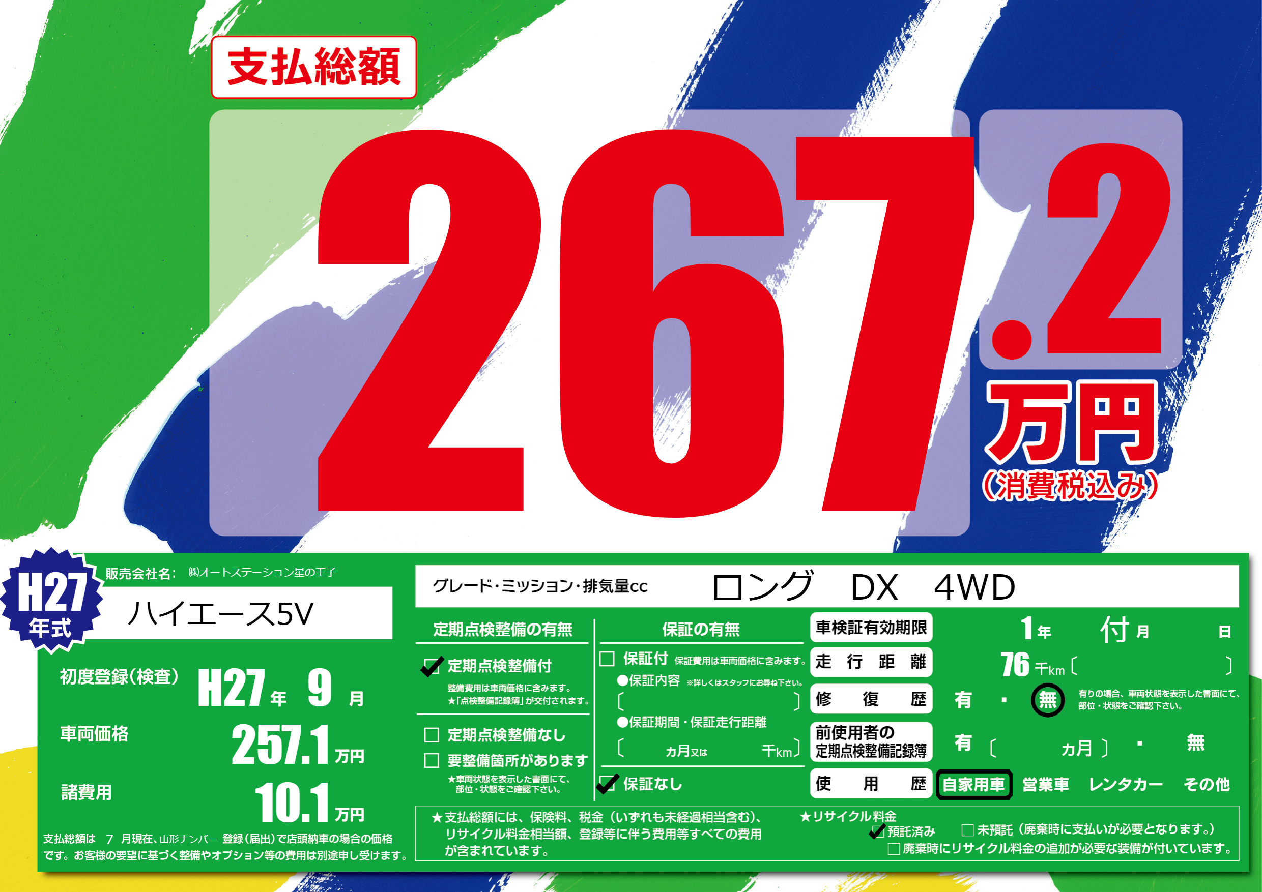 | 車名 | ハイエース5V | グレード ミッション 排気量 |