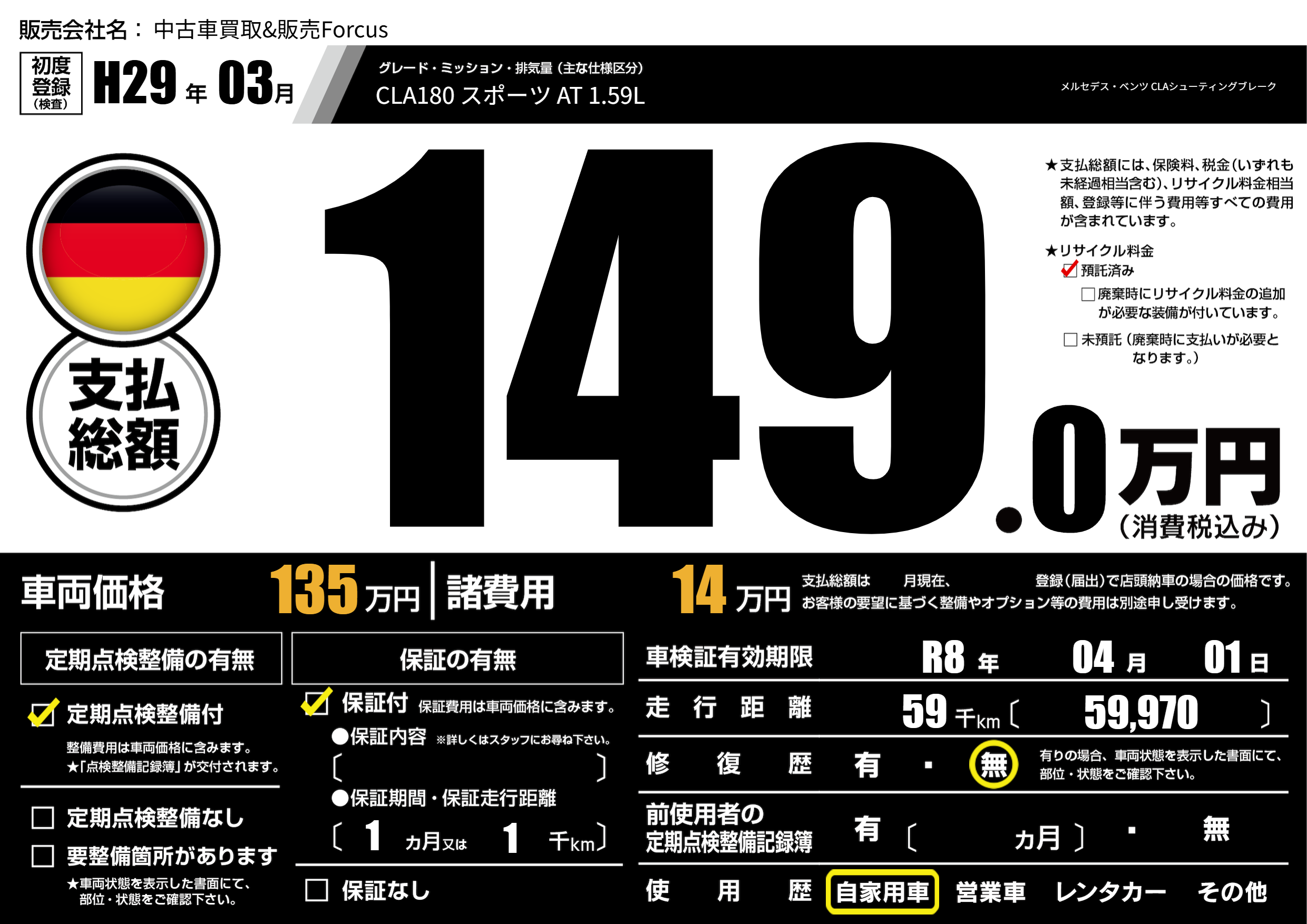| 車名 | メルセデス・ベンツ CLAシューティングブレーク | グレード ミッション 排気量 |