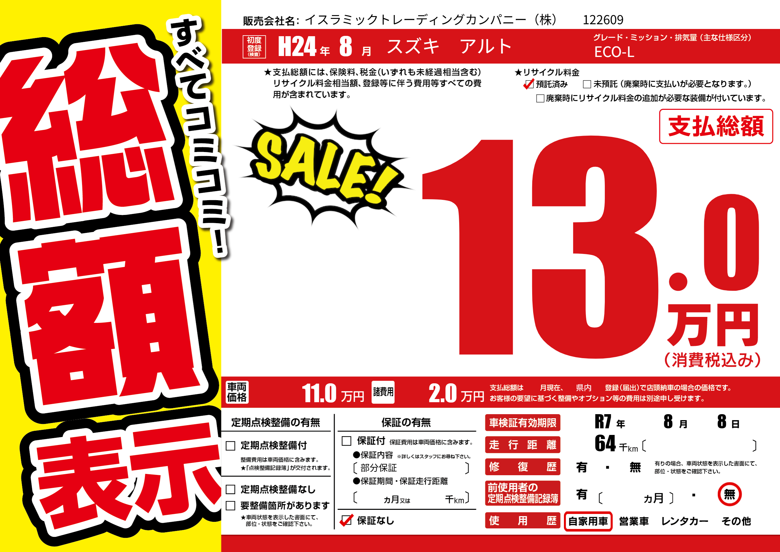 | 車名 | スズキ アルト | グレード ミッション 排気量 |