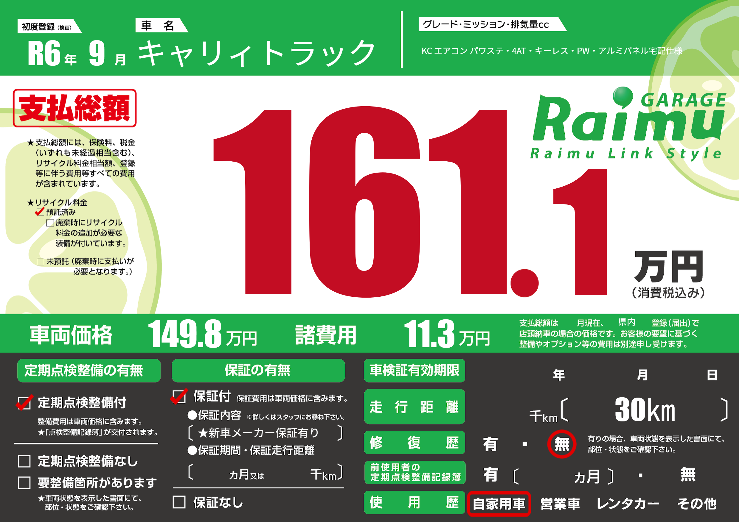 保証付き 保証内容(★新車メーカー保証有り) ヶ月または千km |
