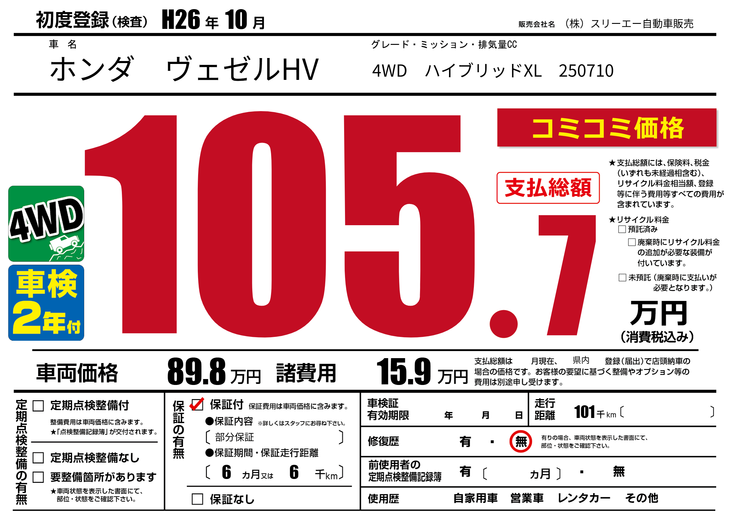 | 走行キロ | 10.1万km | 初年度登録 | H26年10月 |