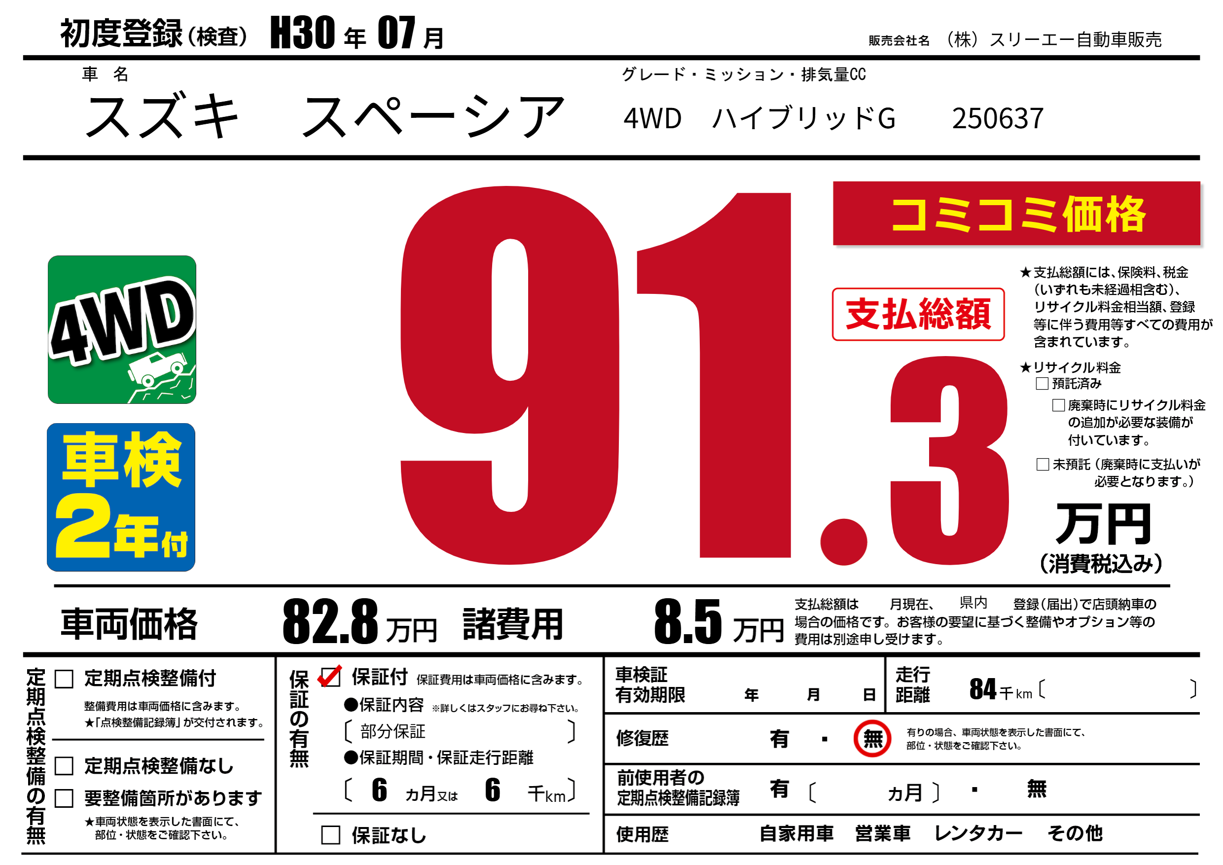 保証付き 保証内容(部分保証) 6ヶ月または(6)千kmまで |