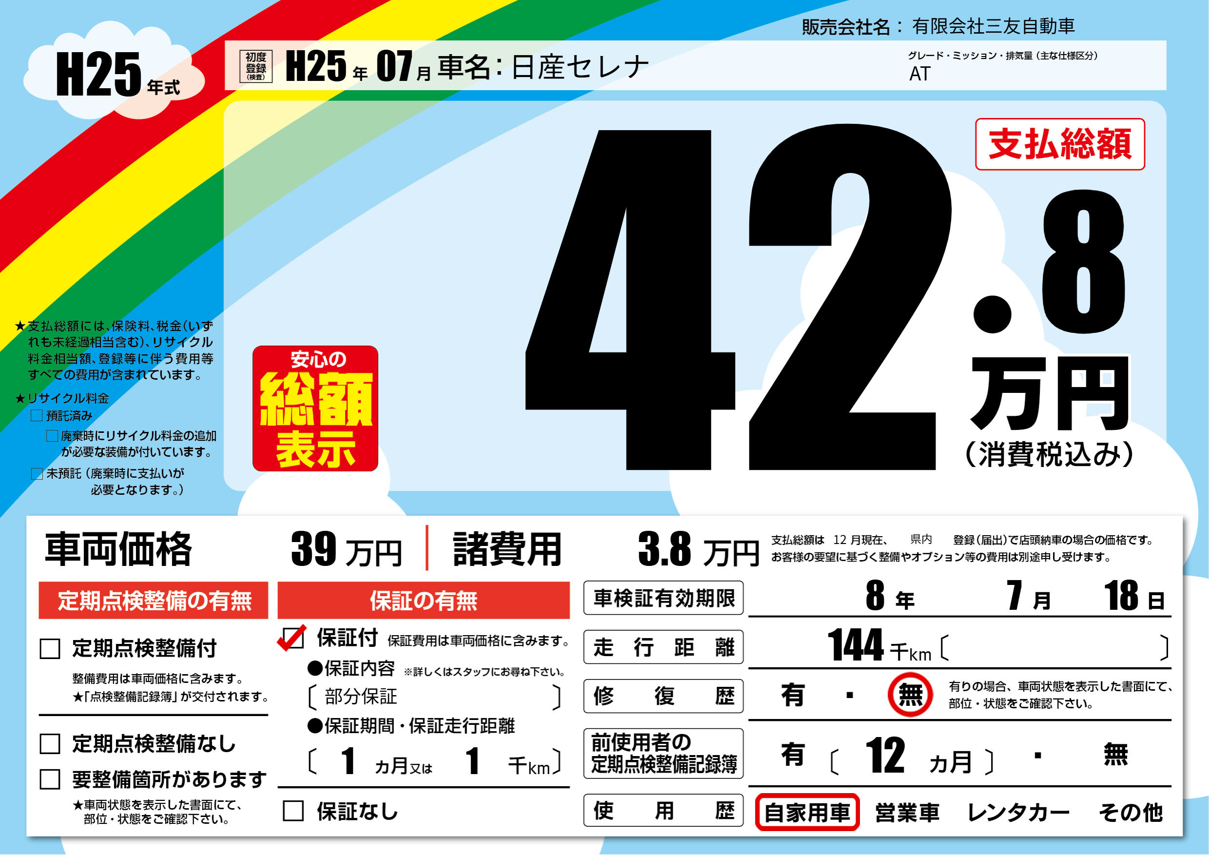 | 走行キロ | 14.4万km | 初年度登録 | H25年07月 |