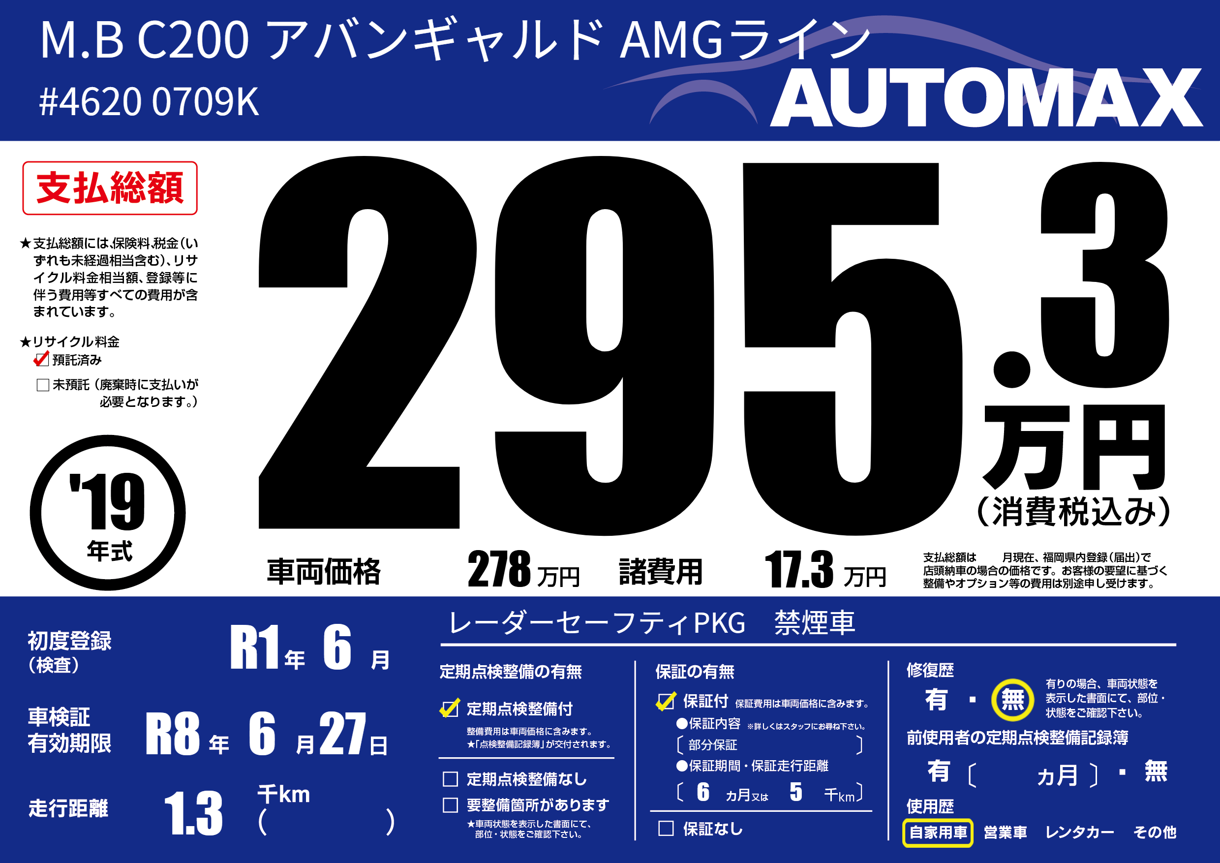 | 車名 | M.B C200 アバンギャルド AMGライン | グレード ミッション 排気量 |