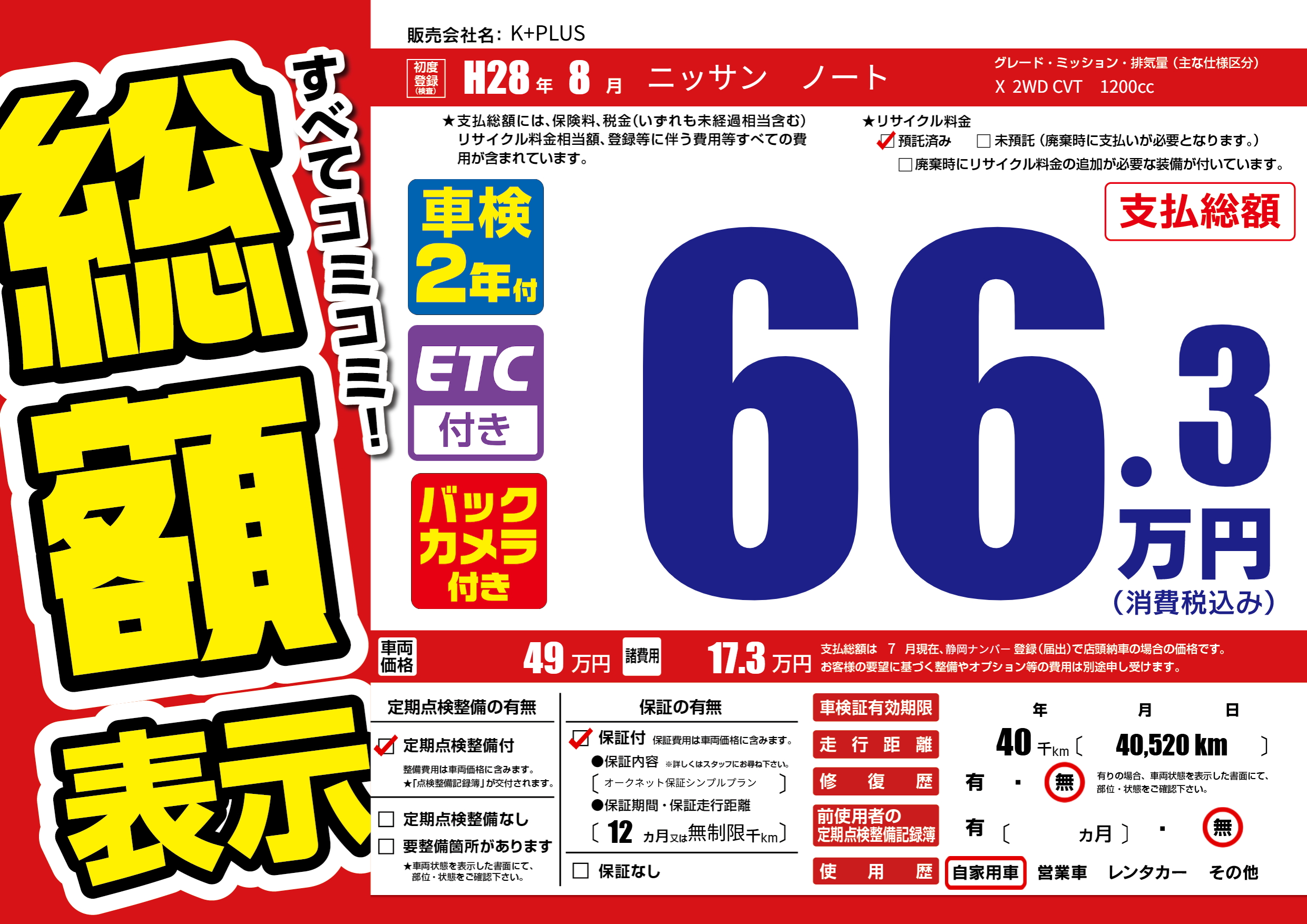 | 走行キロ | 4万km | 初年度登録 | H28年8月 |