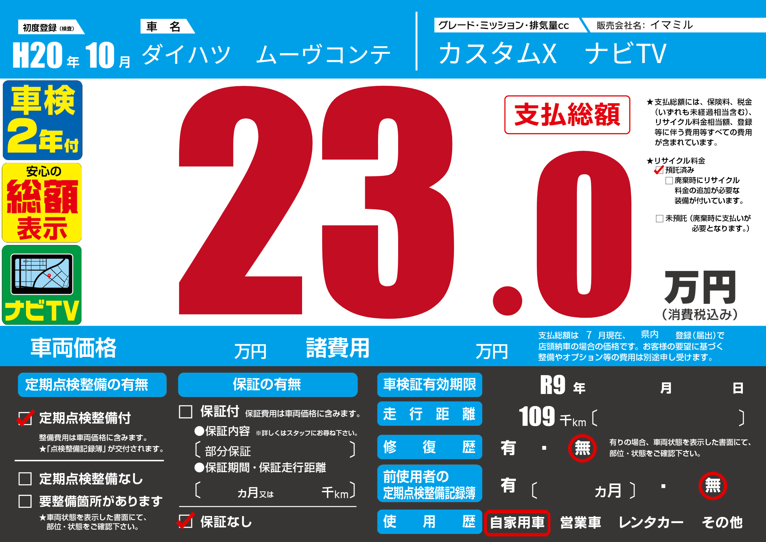 | 走行キロ | 10.9万km | 初年度登録 | H20年10月 |