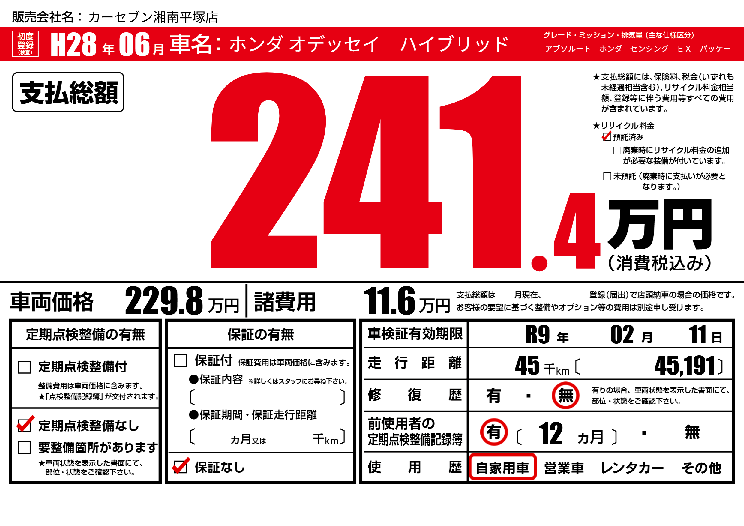 | 車名 | ホンダ オデッセイ ハイブリッド | グレード ミッション 排気量 |
