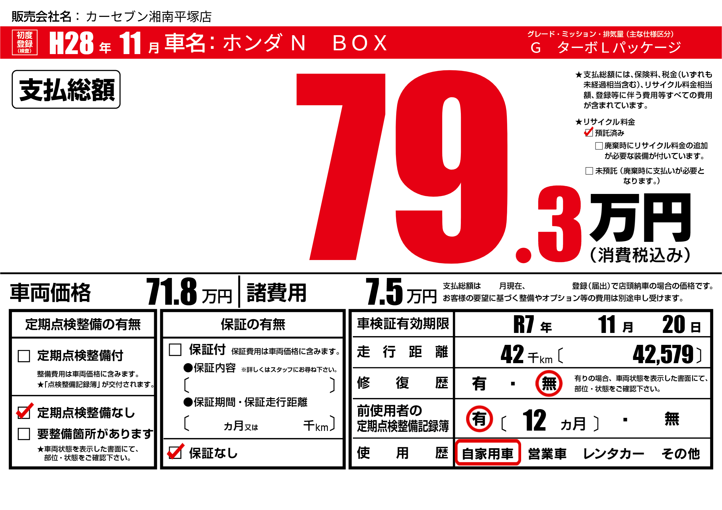 なし | 車検制限 | R7年11月20月 |